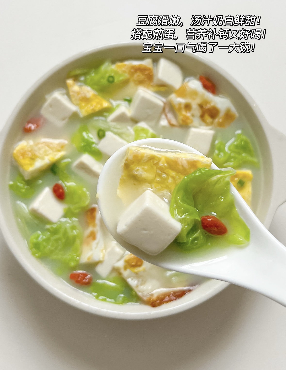 先说买材,千万别学我早期“超市盲选”的翻车现场。白菜要挑“黄心矮脚”——叶子短、颜色奶黄、根部肥厚,这种煮出来自带甜味;豆腐别拿北老豆腐,口感粗糙,也别拿内酯豆腐,一碰就碎,直接选“嫩豆腐”或“水豆腐”,盒装的那种,回家倒扣在砧板上,像拆盲盒一样“啪”一声,整块完整脱壳,光看着就解压。鸡蛋要新鲜,磕开蛋黄能立起来那种,煎出来边缘起泡,香味才足。枸杞纯属“颜值担当”,家里没有就换成虾皮,提鲜效果一样杠杠的。