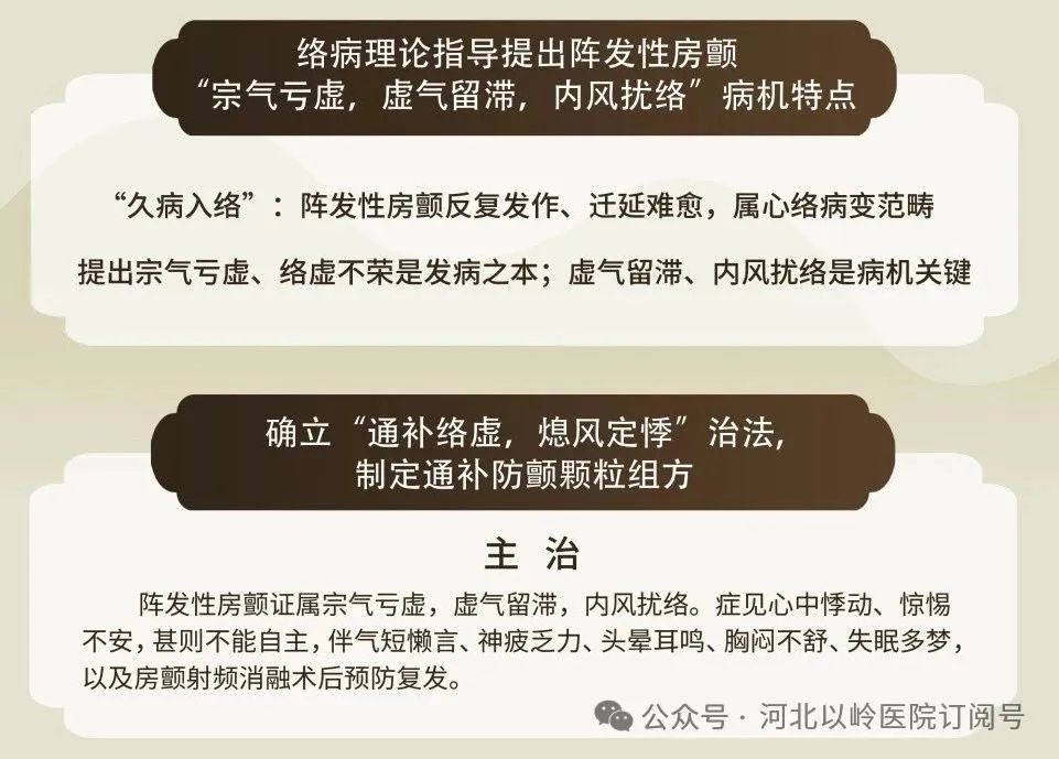 据介绍,通补防颤颗粒是河北以岭医院心血管病科基于络病理论,结合房颤临床诊疗实际合理配伍研制而成的院内制剂。该制剂既能补气升阳、养阴生精,又可活血行气、清热祛风止痛,从而安神除烦,有效改善阵发性房颤患者的心悸、惊惕不安、气短懒言、神疲乏力、头晕耳鸣、胸闷不舒、失眠多梦等症状,提高患者生存质量,并有助于疾病的远期控制管理。除阵发性房颤外,通补防颤颗粒对持续性房颤和射频消融术后预防房颤复发也具有一定疗效。
