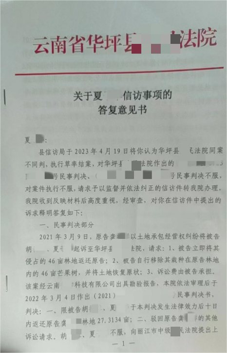 纠纷发生后,双方未能通过协商达成一致,案件最终进入司法程序。法院经审理后作出判决,要求夏某某返还涉案林地并移除其上种植的芒果树。然而,司法判决与实际执行之间出现了明显断层。