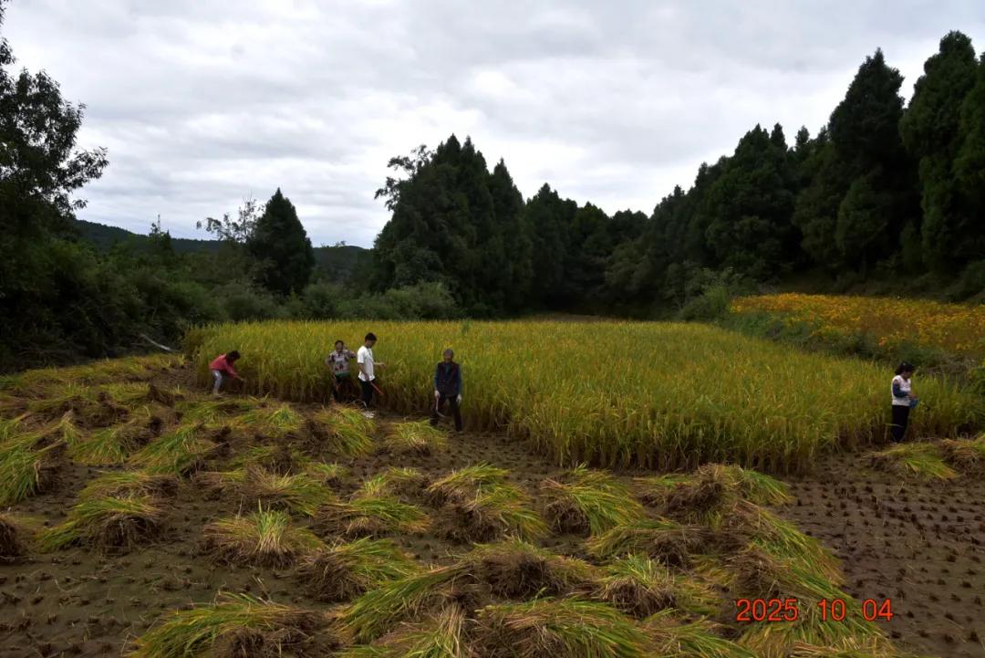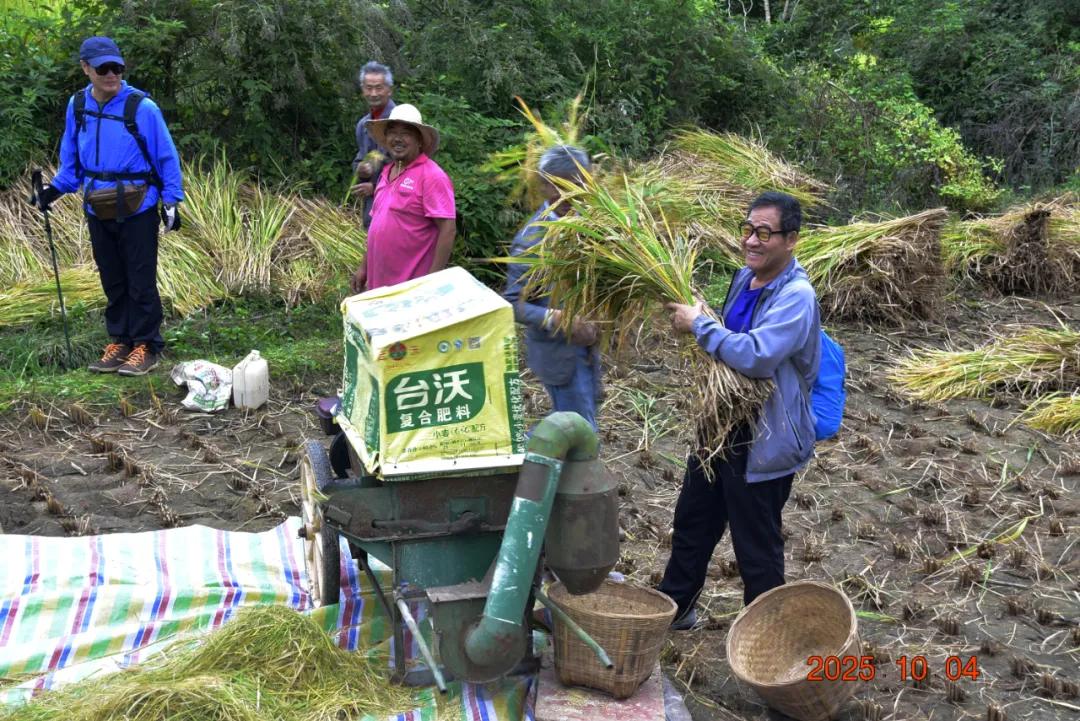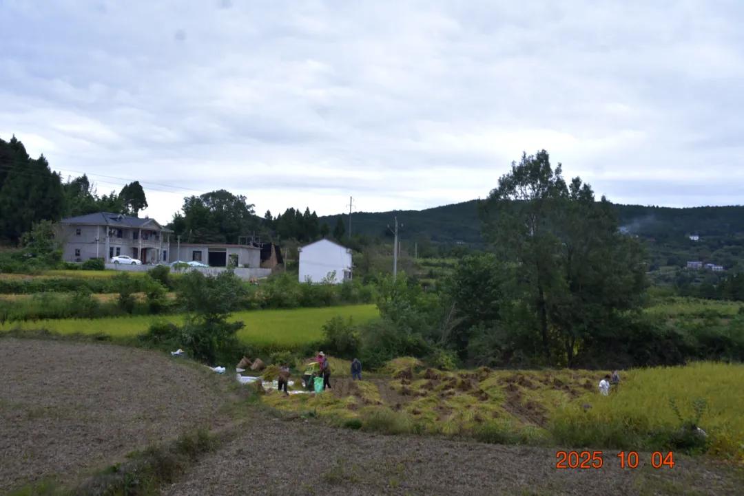 遇到了一户收水稻的,也是亲友们帮忙,用镰刀割水稻,然后地头有小型脱粒机,直接脱粒,打麦子是整颗植株都从脱粒机过,他们只是水稻穗从机子里过一下,就脱粒了,我也是二十多年前甚至三十年前割过麦子,现在好像都是全自动化的了,像他们这样半自动化应该很少了吧,挺新鲜的。