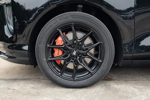 轮毂采用双色花瓣状设计,搭配亮眼的橙色制动卡钳,运动气息十足,行驶时轮毂转动的视觉效果很灵动。车辆配备的 235/50 R20 轮胎,既能提供不错的抓地力,保障操控性能,厚实的胎壁也能过滤部分路面颠簸,提升乘坐舒适性。