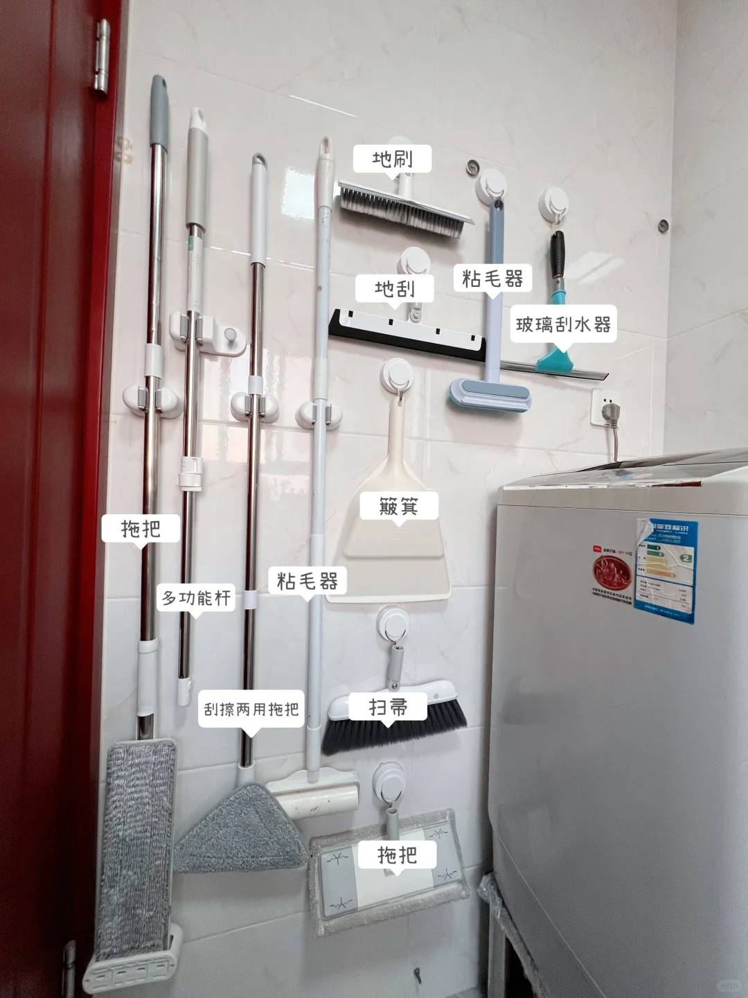 我家就是直接吸在卫生间门的后面,让所有的清洁工具都能上墙收纳,不论是挂板,扫帚、浴刷、除尘滚轮、除尘掸子等等清洁工具,全都上墙并且隐藏在门口。