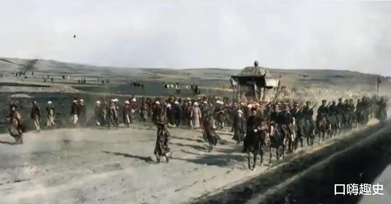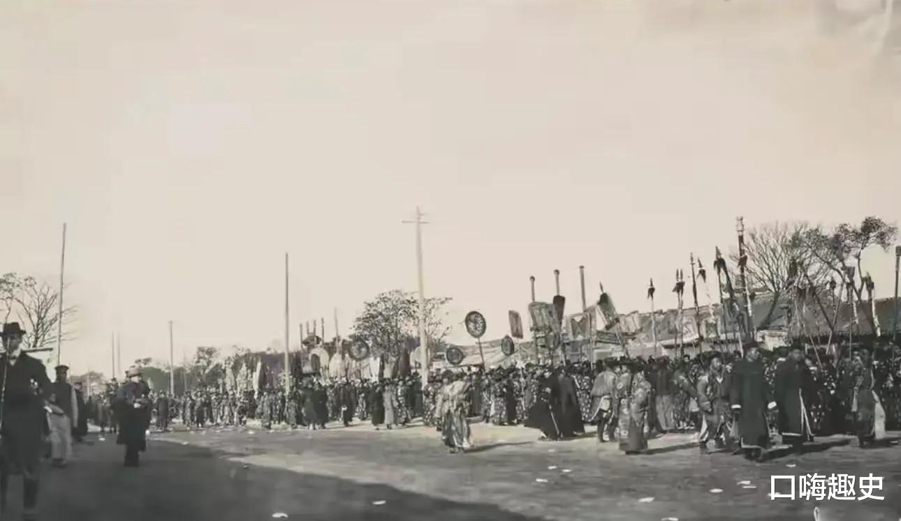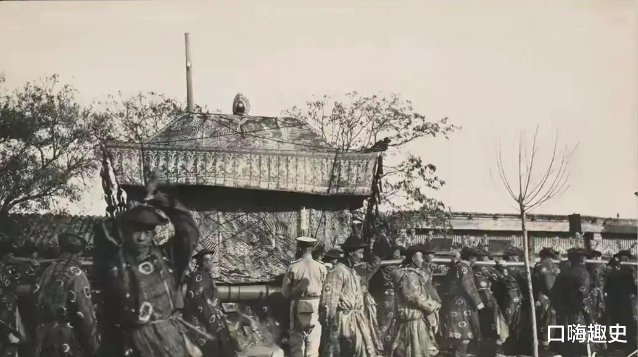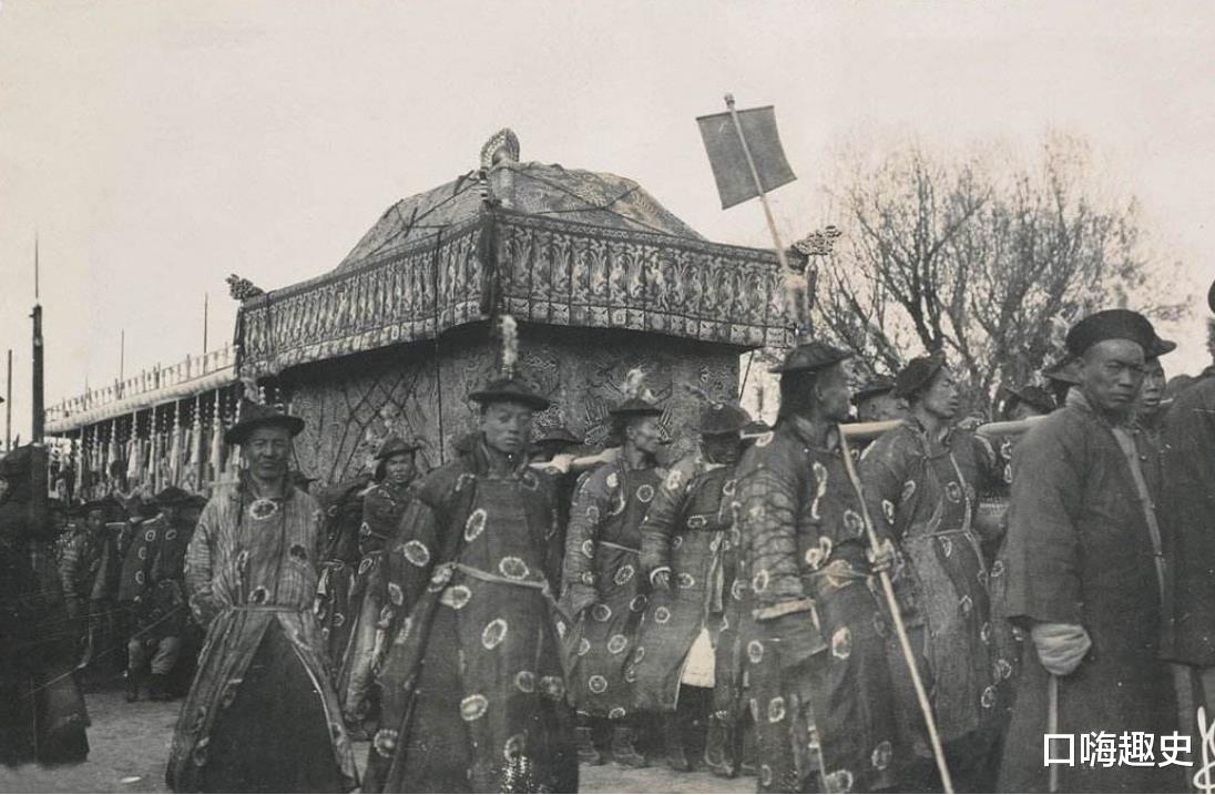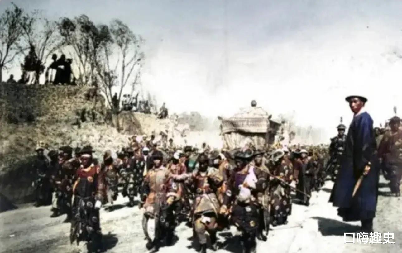 一队身着新式军装的骑兵,手持长矛,装束威武,庄严地走在队伍的最前方,为已故太后开道。紧接着是一列列身穿猩红色绸缎的仆役,他们肩扛着慈禧的灵柩,步伐坚定而统一。