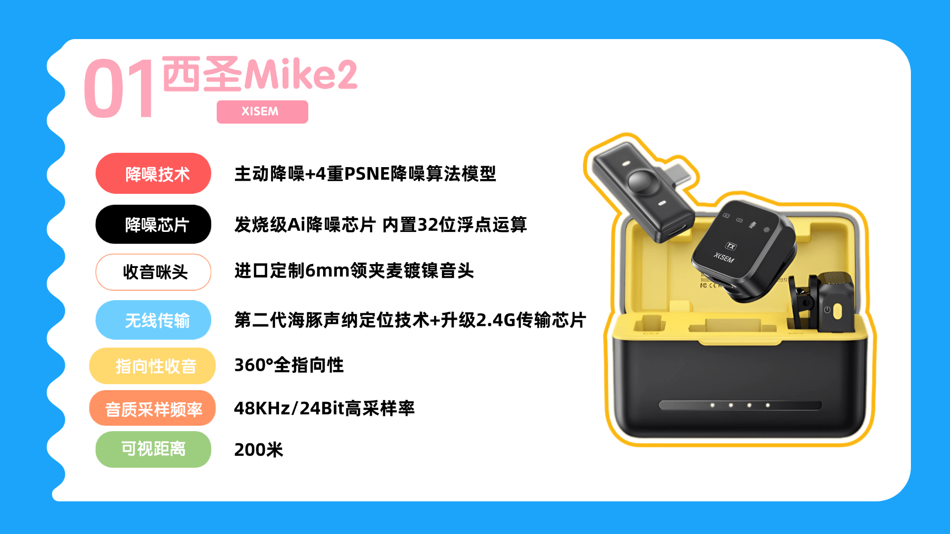 目前无线领夹麦克风市场定价和性能严重不匹配,千元级产品普遍溢价,而低价产品又常常阉割核心配置,导致收音模糊、降噪失效、啸叫干扰、传输不稳等问题频繁。西圣作为国产少数富有匠人精神的音频品牌,从不靠补贴和广告堆量,而是把研发经费用在拾音和传输核心环节。Mike2面向需要高标准录音的用户打造,坚持不牺牲性能、不妥协品质,100+的价格,却以硬核参数和实际表现名气火爆,在百元价位段几乎没有直接对手。
