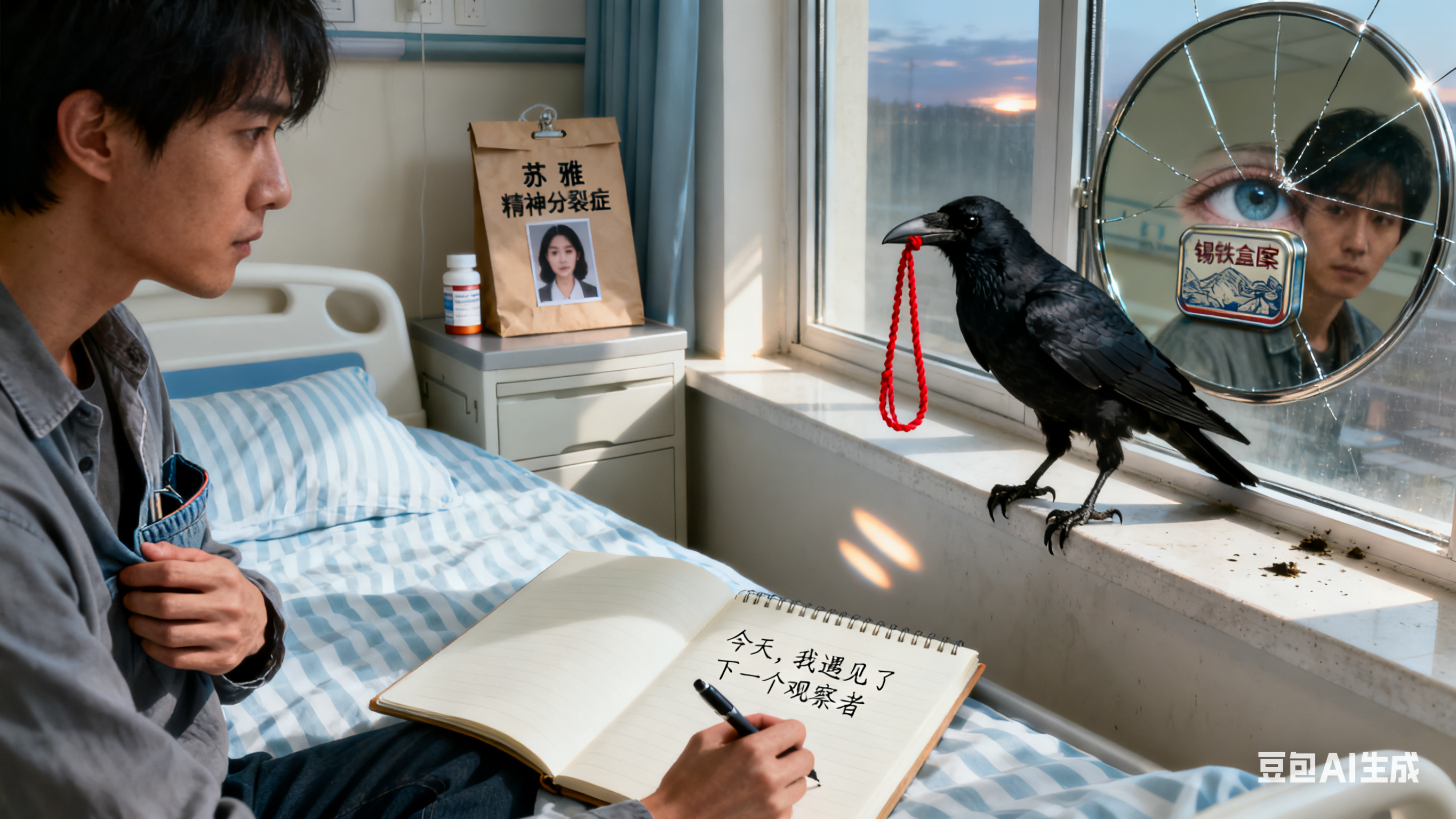 窗外,一只乌鸦落在窗台,衔着崭新的红绳。陈默突然笑了。他翻开新买的笔记本,写下第一行字:“今天,我遇见了下一个观察者。”
