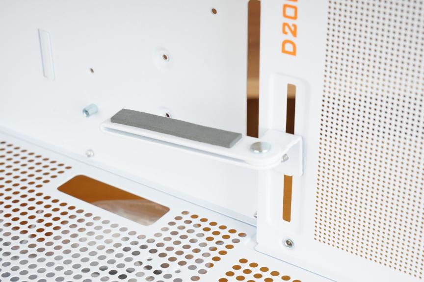 乔思伯D200的背部金属板只在前部侧面进风口做了一定面积的MESH效果以此来保证散热效果。