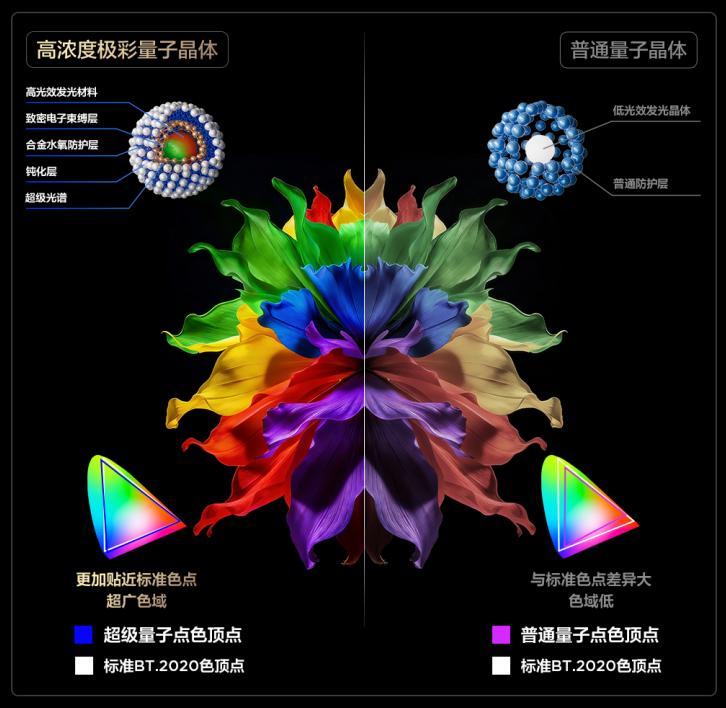 在色域表现上,SQD-Mini LED通过超级量子点与超级蝶翼华曜屏的组合,达成100% BT.2020全局高色域,打破十年色域瓶颈。不同于RGB-Mini LED的 “局部高色域”,它在单色和复杂多色画面中都能保持色彩稳定,无串色、偏色问题,色准ΔE<0.9 达到专业级标准。
