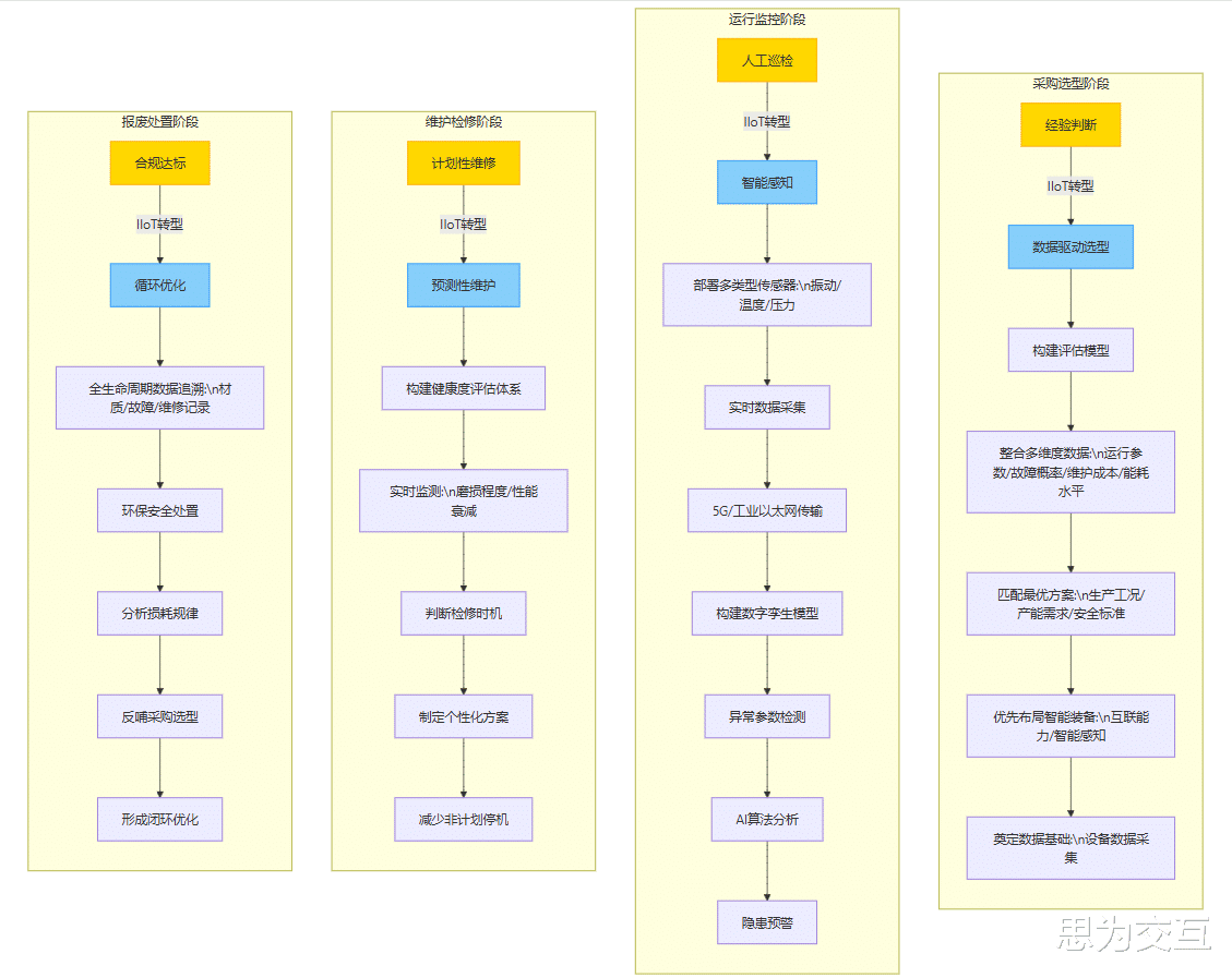 在报废处置阶段,IIoT 实现了设备处置从 “合规达标” 到 “循环优化” 的延伸。设备全生命周期数据的完整追溯,能够清晰记录设备使用过程中的材质信息、故障历史、维修记录等关键内容,为报废处置提供精准数据支撑,确保处置过程符合环保标准与安全规范,规避处置不当带来的环境风险与安全隐患。同时,通过分析设备报废数据,可总结设备损耗规律与使用寿命影响因素,反哺采购选型环节,为后续设备选型提供数据参考,推动设备管理形成 “采购 - 运行 - 维护 - 报废 - 再采购” 的全流程闭环优化,提升设备管理整体效益。