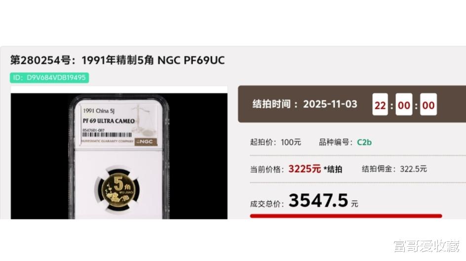 上面这枚1991年的“梅花5角”(精制币),NGC评级69分,在2025年11月3日的“春秋大拍”中,最后拍出了3547.5元。