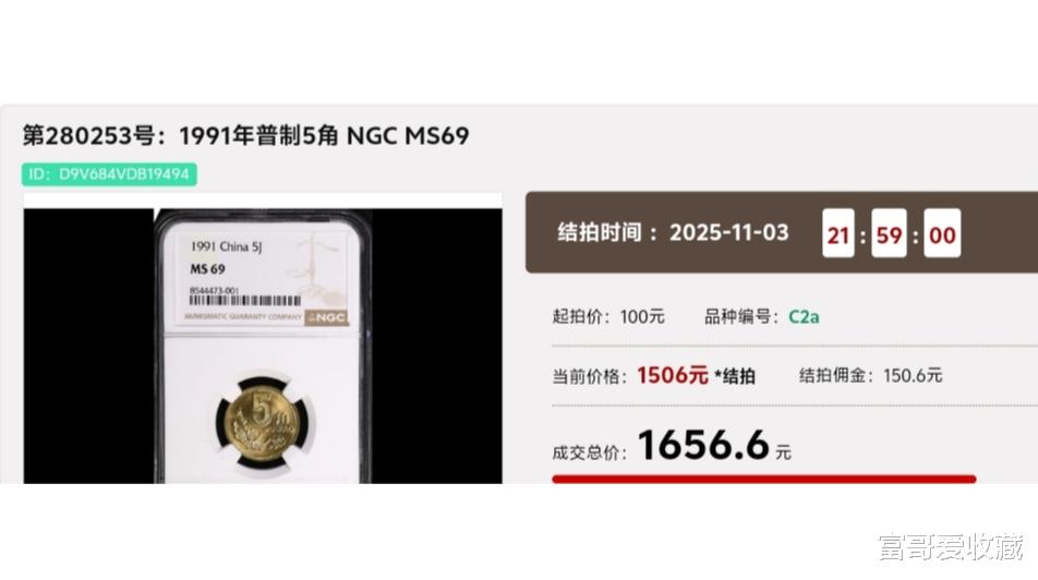 上面这枚1991年的“梅花5角”(普制币),在2025年11月3日的“春秋大拍”中,就拍出了1656.6元。