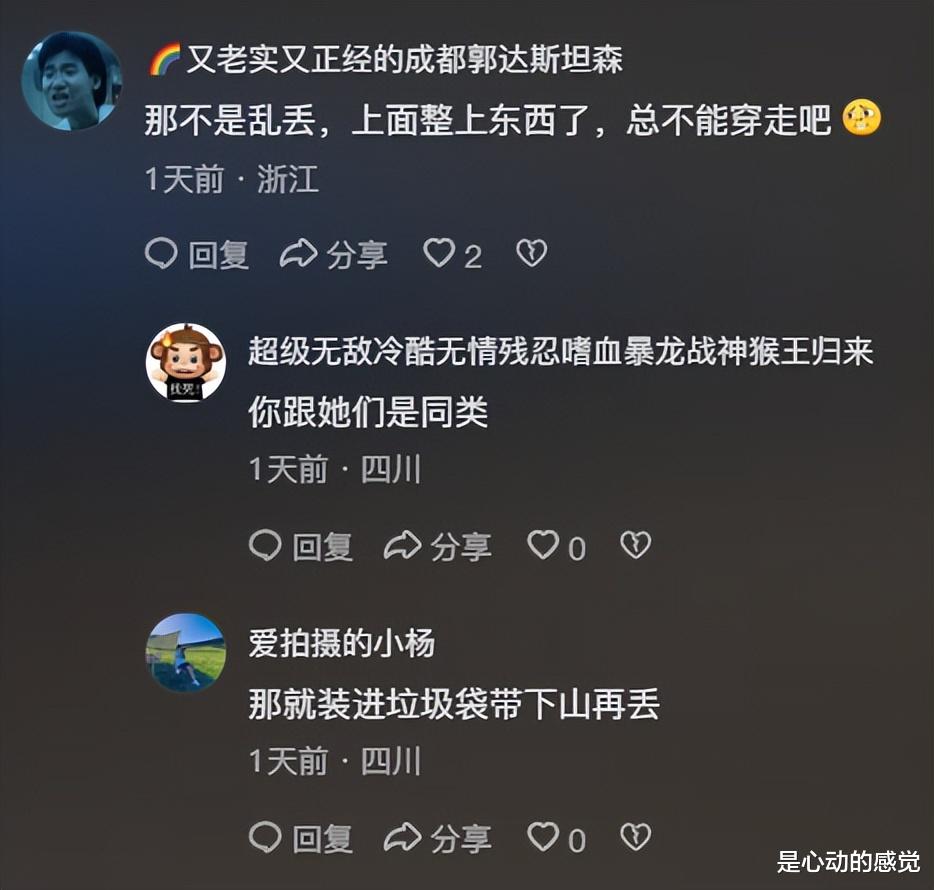 在拍摄视频曝光的同时,男子也揭露了很多人不雅的行径,像是这些把垃圾随意丢弃的,内衣拖鞋都不要的,这种团队压根就不是真的来爬山的,大多都是一些年轻人组团来到这里拍个照发个圈,只要能出片,才不会去多管其他的。
