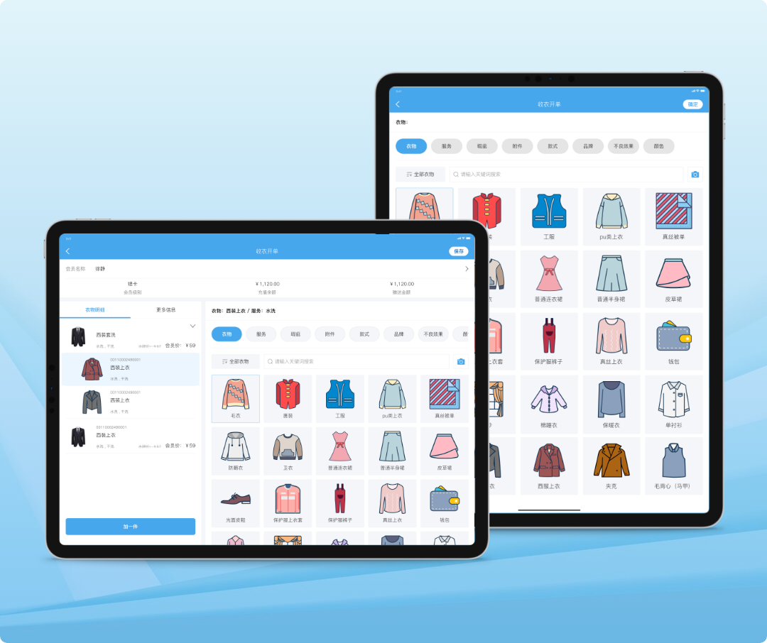 ◎ 员工使用平板APP开单或上门收衣,彰显洗衣店高端的服务形象。