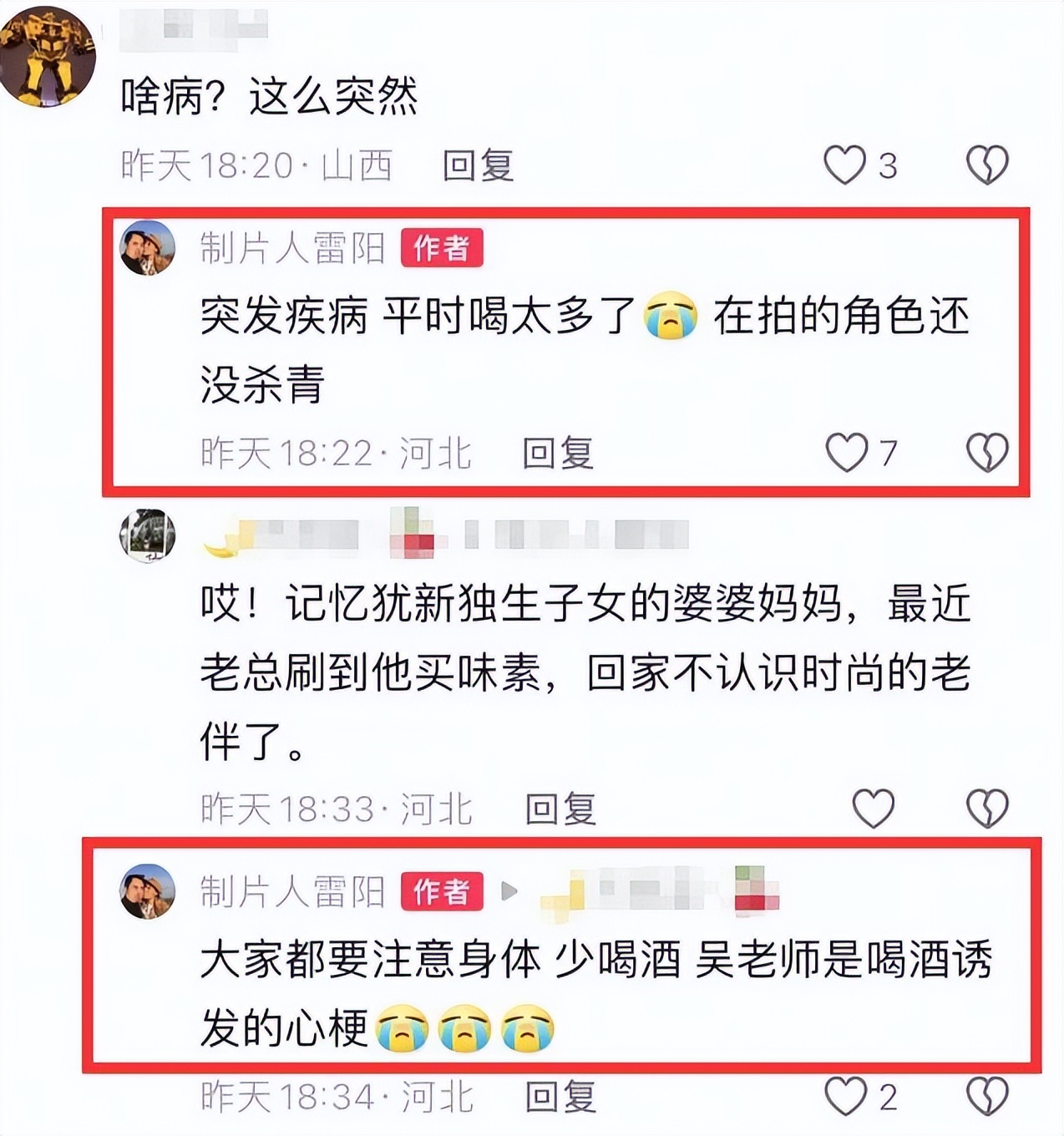 由此可知,吴连生从剧组回到老家哈尔滨之后,肯定不会好好吃饭,在加之感冒后还天天喝酒。