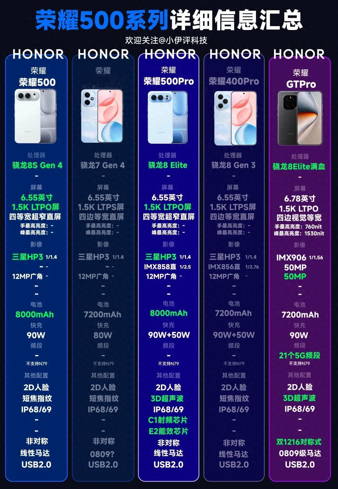 价格方面,荣耀500系列的整体售价预计还会和前代保持一致,也就荣耀500 2499元起;荣耀500Pro 3399元起。