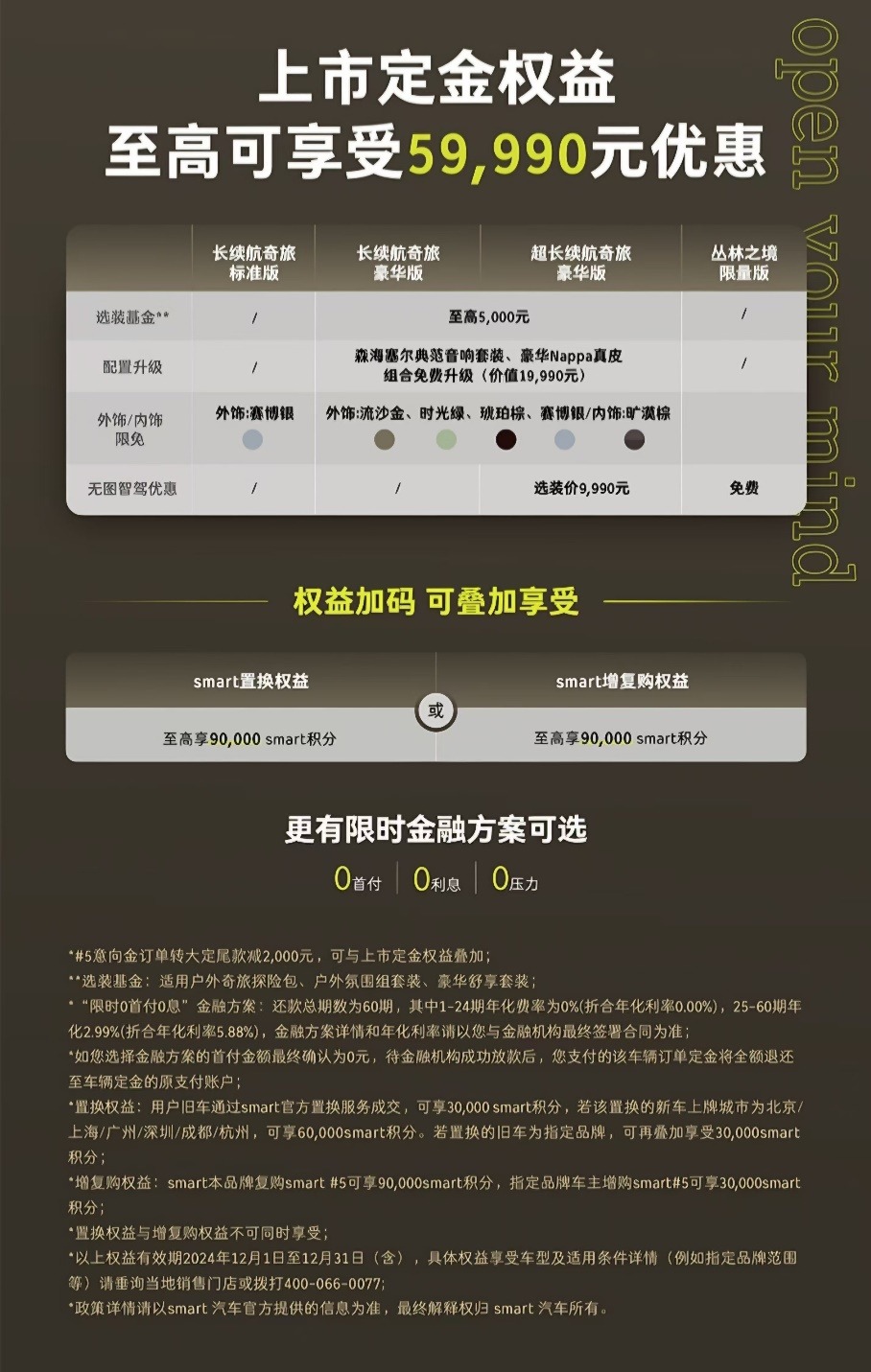 为回馈广大密友厚爱,下定全新smart精灵5号,可至高享受59,990元优惠。下定长续航奇旅豪华版、超长续航奇旅豪华版的用户,可获至高5,000元选装基金,还可免费升级价值19,990元森海塞尔音响套装+豪华Nappa真皮组合,更可免费获得限免车色。此外,下定全新smart精灵5号还可享低息金融方案、至高可享90,000 smart积分的置换权益或复购权益等。