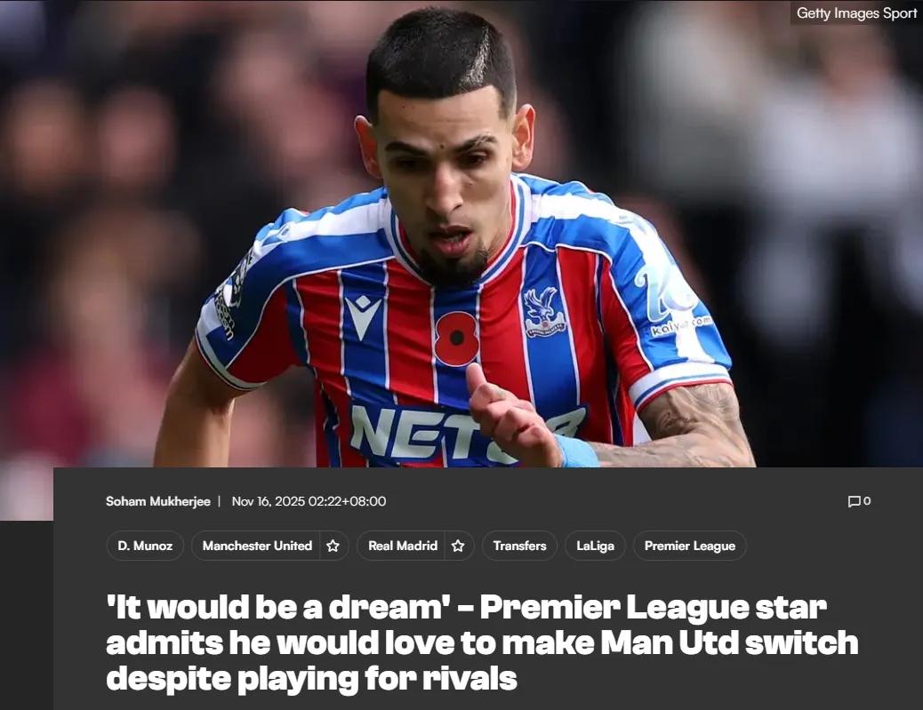 水晶宫球星丹尼尔-穆尼奥斯接受哥伦比亚阿斯报采访时承认,他希望加盟曼联等豪门,这名29岁的边后卫已经引起了巴萨、巴黎等俱乐部的兴趣。