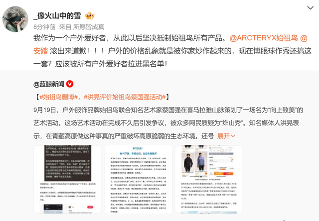 对于网友的愤怒,始祖鸟和安踏并没有第一时间做出任何回应,反而删除了官方的博文,这进一步引起了网友的愤怒。