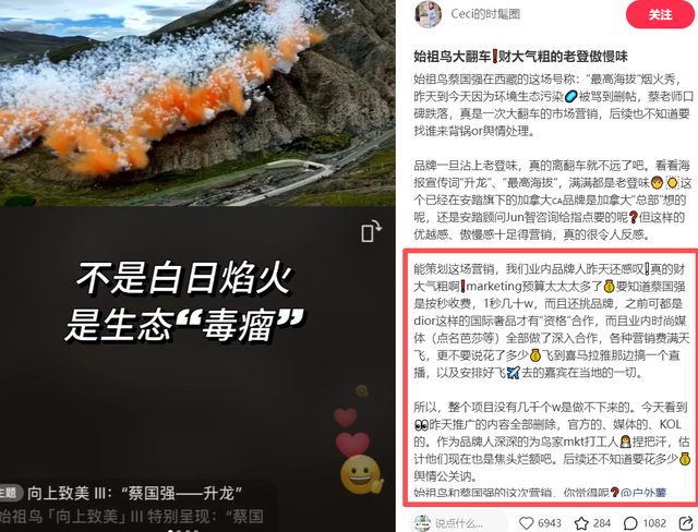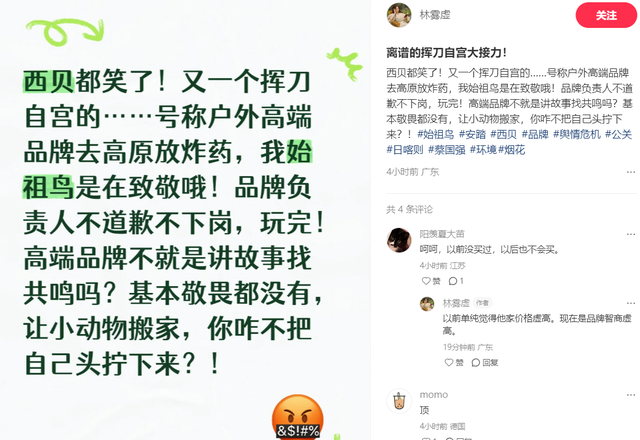 号称户外高端品牌去高原放炸药,我始祖鸟是在致敬哦!品牌负责人不道歉不下岗,玩完!高端品牌不就是讲故事找共鸣吗?基本敬畏都没有,让小动物搬家,你咋不把自己头拧下来?!