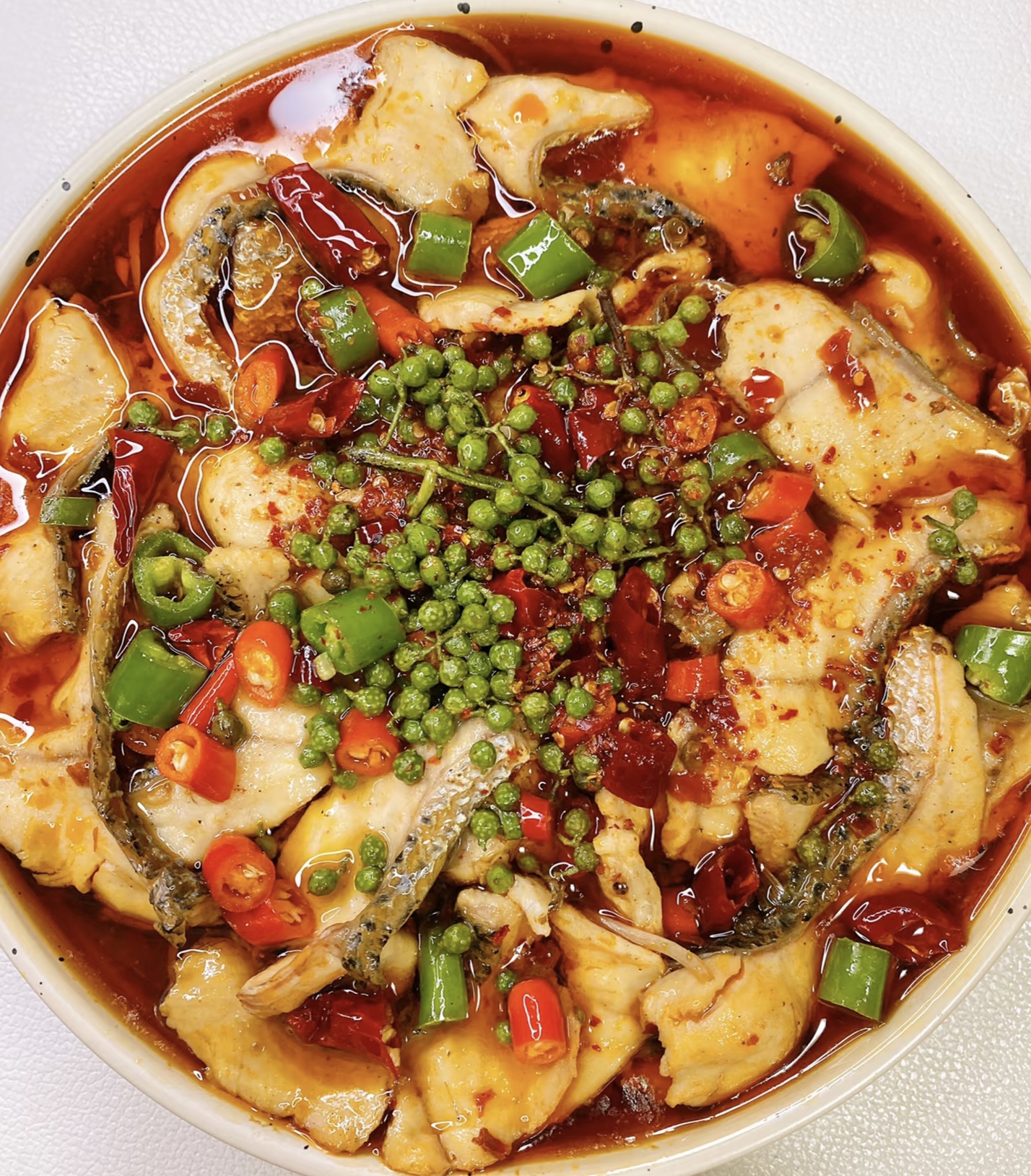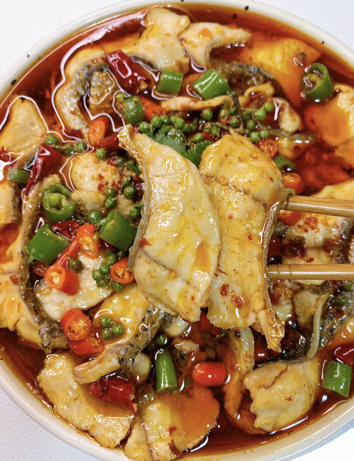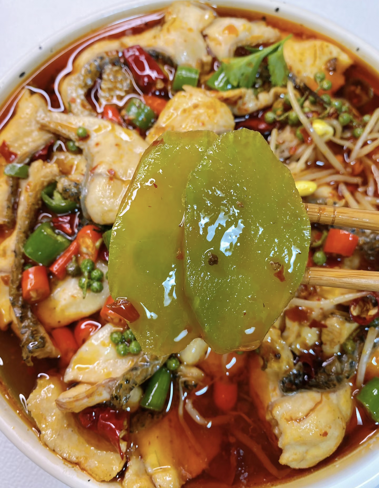 汤底调好后,转大火让水沸腾,然后关火!没错,就是关火!把腌好的鱼片一片片下入锅中,全部下完后开小火煮1分钟,再用筷子轻轻拨散。鱼片变白卷曲就赶紧捞出来,别煮太久,否则鱼肉会变老。煮好的鱼片铺在配菜上(配菜可以用豆芽、莴笋、木耳,提前焯水垫底),再把汤底倒进去,表面撒一把干辣椒段和青花椒。