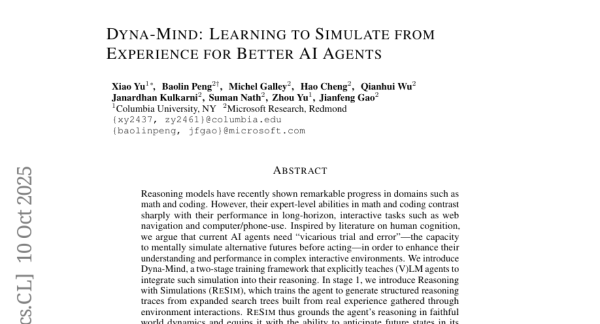 当我们遇到困难时,会在脑海中模拟各种可能的解决方案,这种"心理预演"能力是人类智慧的重要标志。如今,微软研究院和哥伦比亚大学的科学家们正试图将这种能力赋予人工智能。2025年10月,这个由哥伦比亚大学余晓和微软研究院彭宝林共同领导的研究团队,在ICLR 2026会议上提交了一项名为"DYNA-MIND: LEARNING TO SIMULATE FROM EXPERIENCE FOR BETTER AI AGENTS"的重要研究。有兴趣深入了解的读者可以通过arXiv:2510.09577v1查询完整论文。
