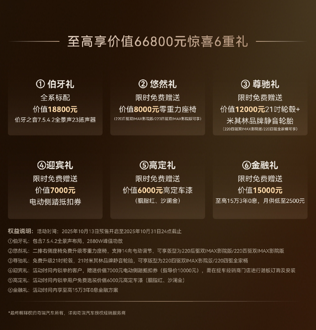 除了预售价以外,风云T11本次还提供了价值66800元的惊喜6重礼。包括全系标配价值18800元的伯牙之音7.5.4.2全景声音响、限时免费送价值8000元的零重力座椅、价值12000元的21英寸轮圈(搭配米其林静音轮胎)、价值7000元的电动侧踏抵扣券、价值6000元的高定车漆(胭脂红、沙澜金)以及价值15000元的金融礼,综合来看还是很有诚意的。