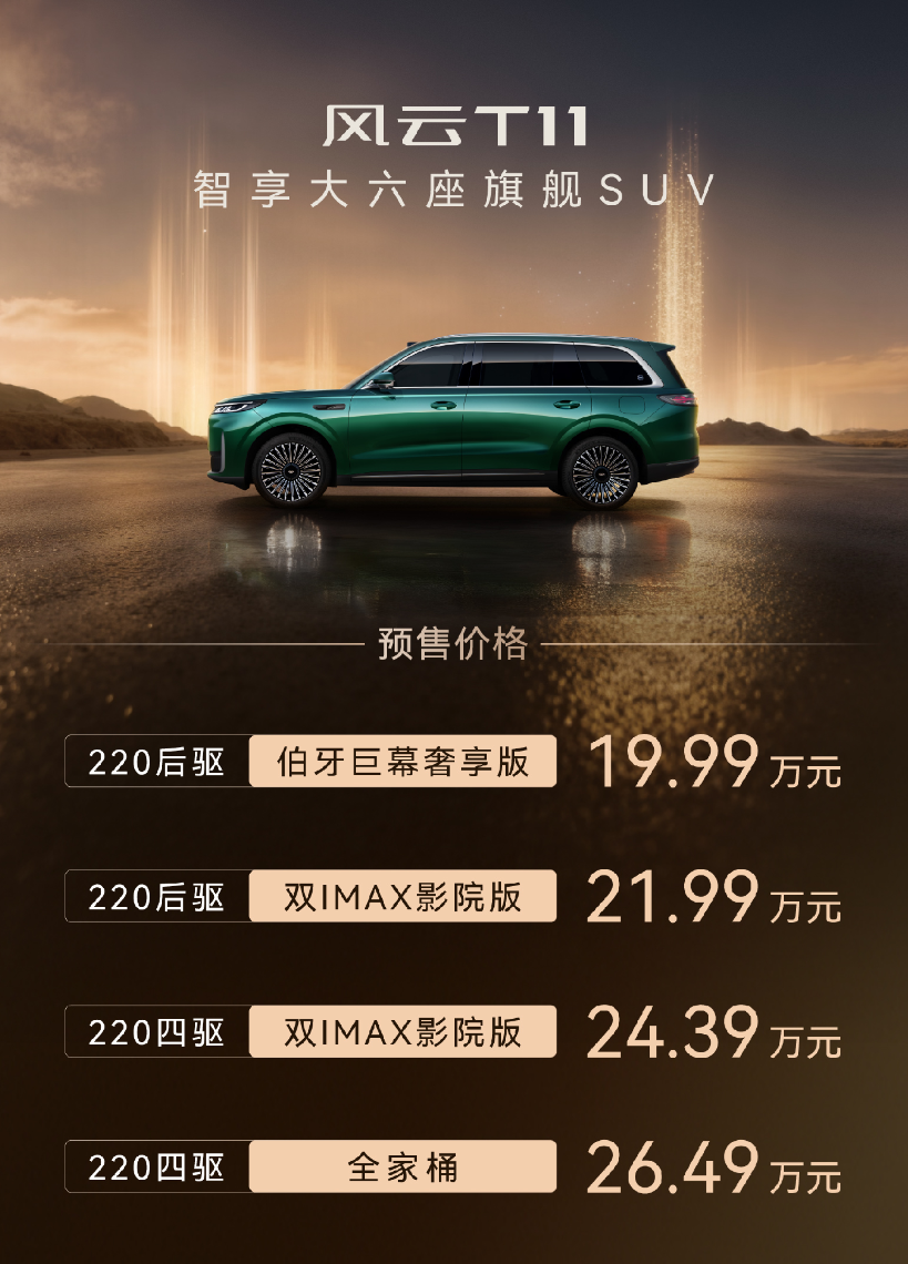 2025年10月13日,风云T11正式开启预售。新车在豪华体验、车内空间以及核心的动力安全方面都非常有看点。新车本次共推出4款车型,官方预售价区间为19.99万-26.49万元。