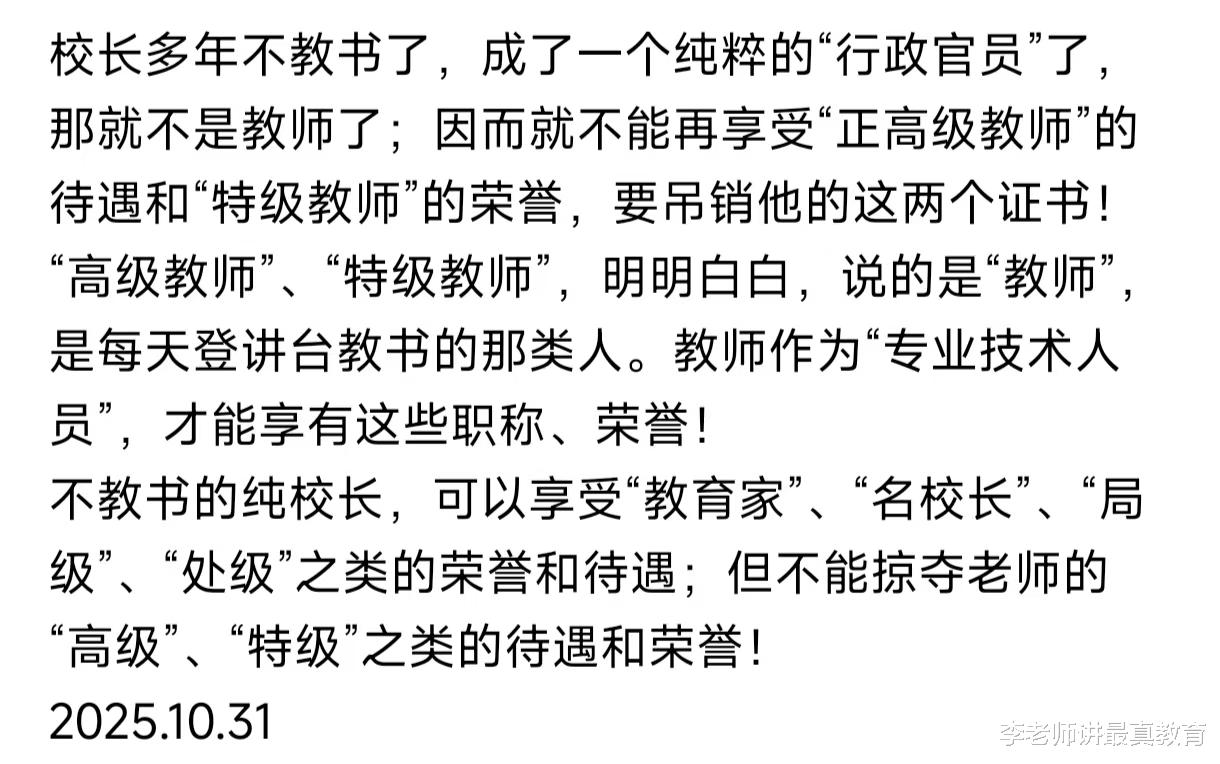 这位网友说:校长多年不教书了,成了一个纯粹的“行政官员”了,那就不是教师了。因而就不能再享受“正高级教师”的待遇和“特级教师”的荣誉,要吊销他的这两个证书。高级教师、特级教师,明明白白说的是教师,是每天登台教书的那类人。教师作为“专业技术人员”,才能享受这些职称和荣誉!不教书的纯校长,可以享受“教育家、名校长、局级、处级”之类的荣誉和待遇,但不能掠夺老师的“高级特级”之类的待遇和荣誉!