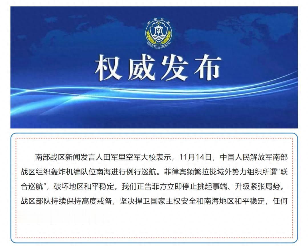 11月16日,据“南部战区”微信公众号:南部战区新闻发言人田军里空军大校表示,11月14日,中国人民解放军南部战区组织轰炸机编队位南海进行例行巡航。菲律宾频繁拉拢域外势力组织所谓“联合巡航”,破坏地区和平稳定。我们正告菲方立即停止挑起事端、升级紧张局势。战区部队持续保持高度戒备,坚决捍卫国家主权安全和南海地区和平稳定,任何侵权滋事企图都不会得逞。