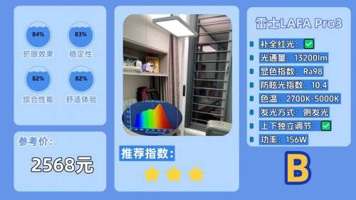 落地护眼大路灯的十大品牌有哪些?雷士这款未来光Pro 3.0大路灯灯珠数量达到了489颗,整体光通量约13200lm,亮度表现不低,同时凭借1.06的光照均匀度,视觉上没有明显阴影区,另外雷士还是一款色温支持2700K到5000K之间自由调节的护眼大路灯,实际光线照度符合AA级照明要求,不过要注意的是,雷士这款护眼灯在5000k色温下,蓝光峰值接近0.9,处于一个比较高的水平。