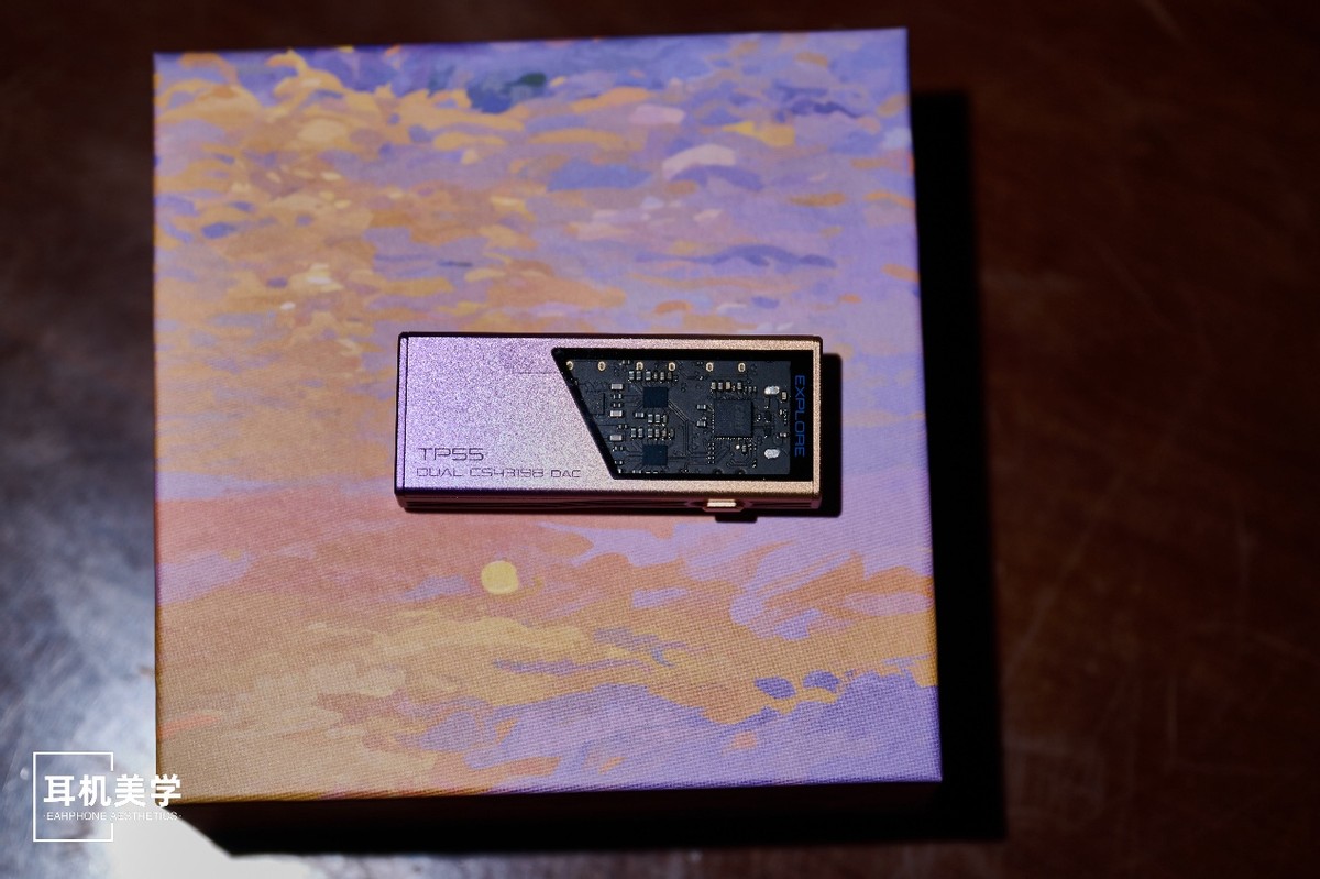 将盒面上半部分抽拉出去,内部封面是一整幅印象派风格的夕阳海景画面,紫金交融的色彩过渡细腻柔和,颇有艺术品气质。可以看出 EPZ 在 TP55 这款产品上不仅仅把它视作一件音频设备,更希望通过视觉语言传递出“温暖、从容、富有光感”的产品印象。