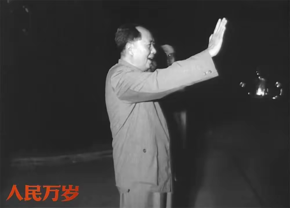 毛主席在天安门城楼上挥帽致意,高呼:“人民万岁!”