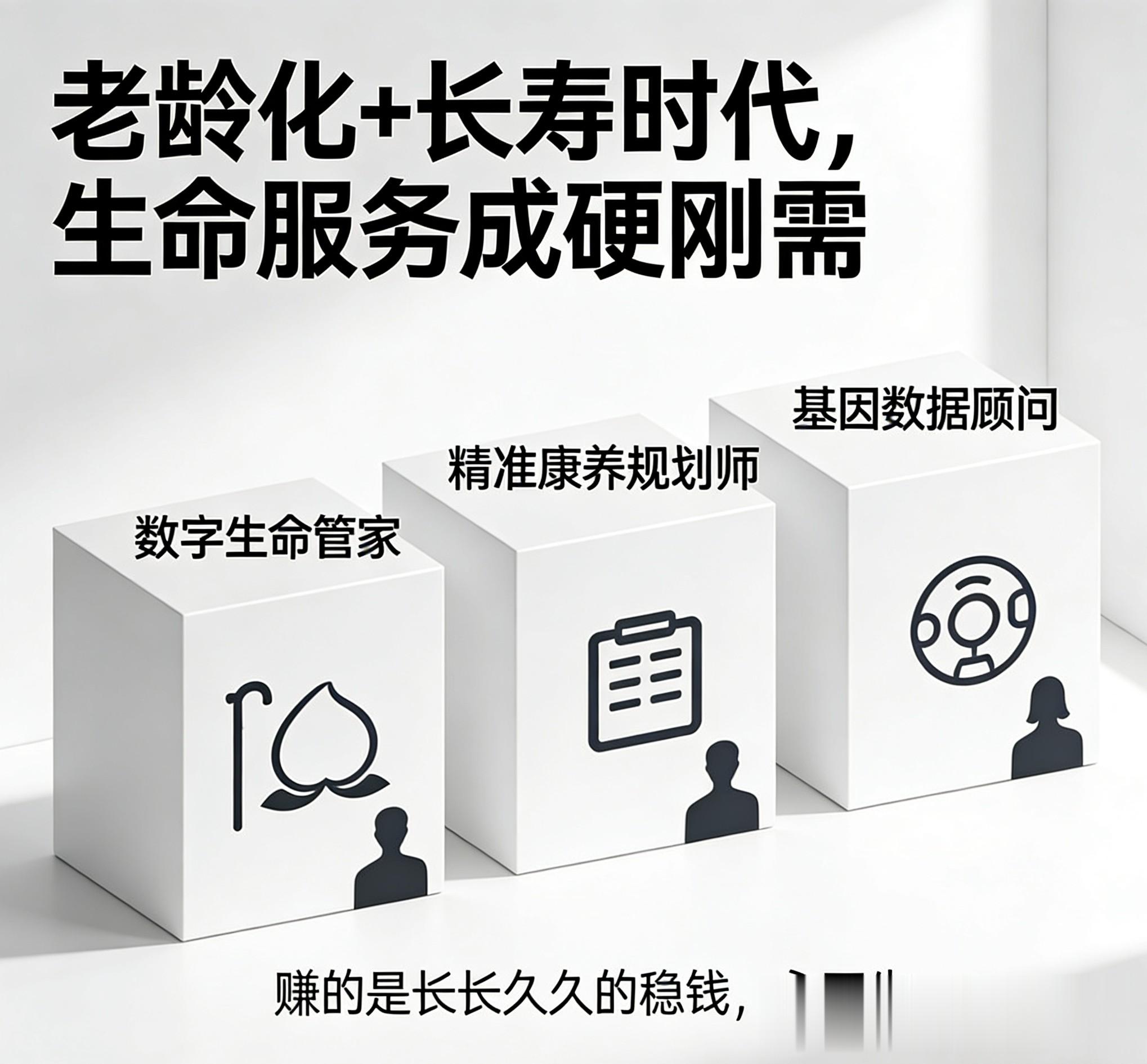 老龄化+长寿时代,生命服务成硬刚需。数字生命管家、精准康养规划师、基因数据顾问,赚的是长长久久的稳钱,永不失业。