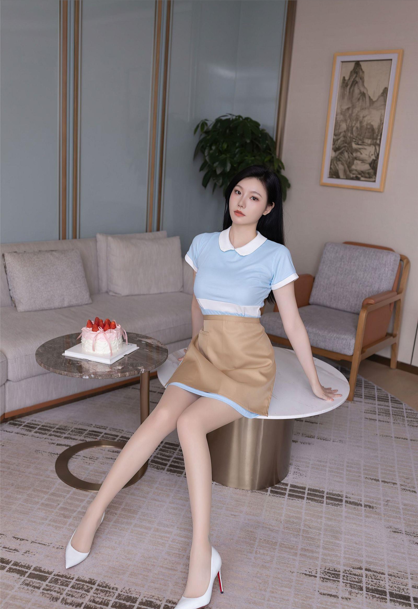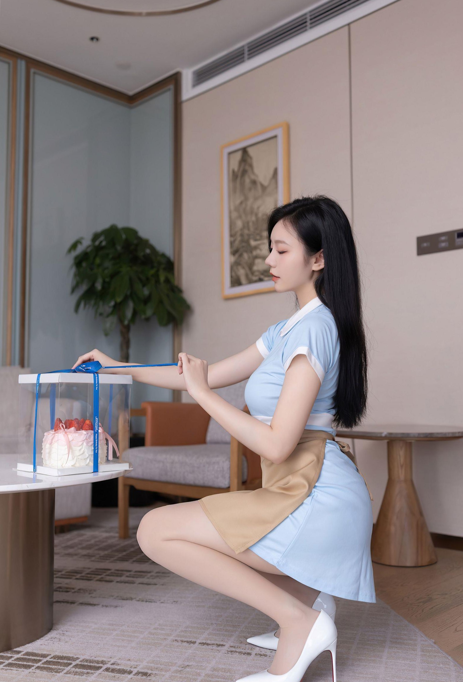 一位长发女子身着浅蓝色连衣裙配米色围裙、白色高跟鞋,正蹲姿系蛋糕盒蓝丝带。室内环境雅致,有沙发、绿植、挂画,整体氛围温馨