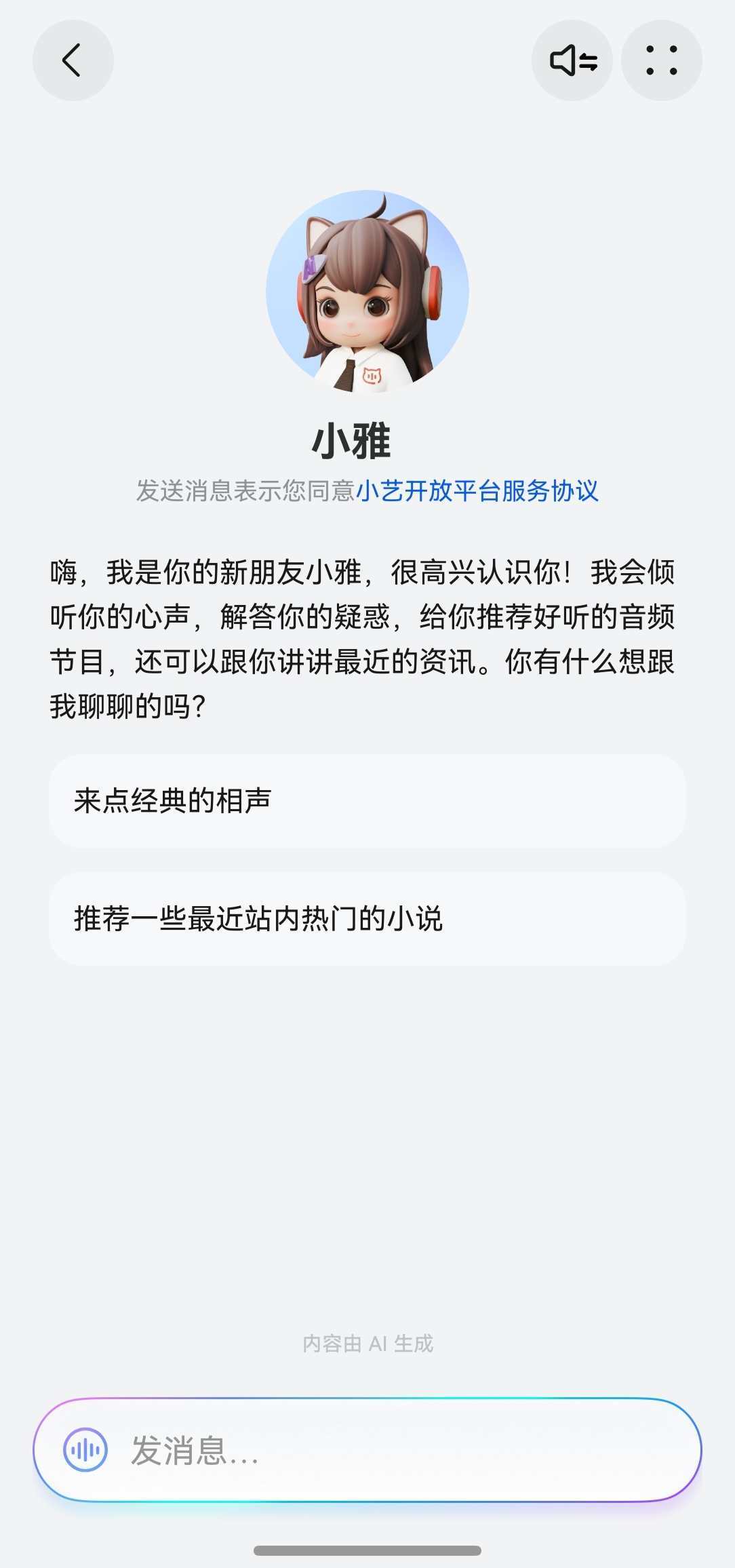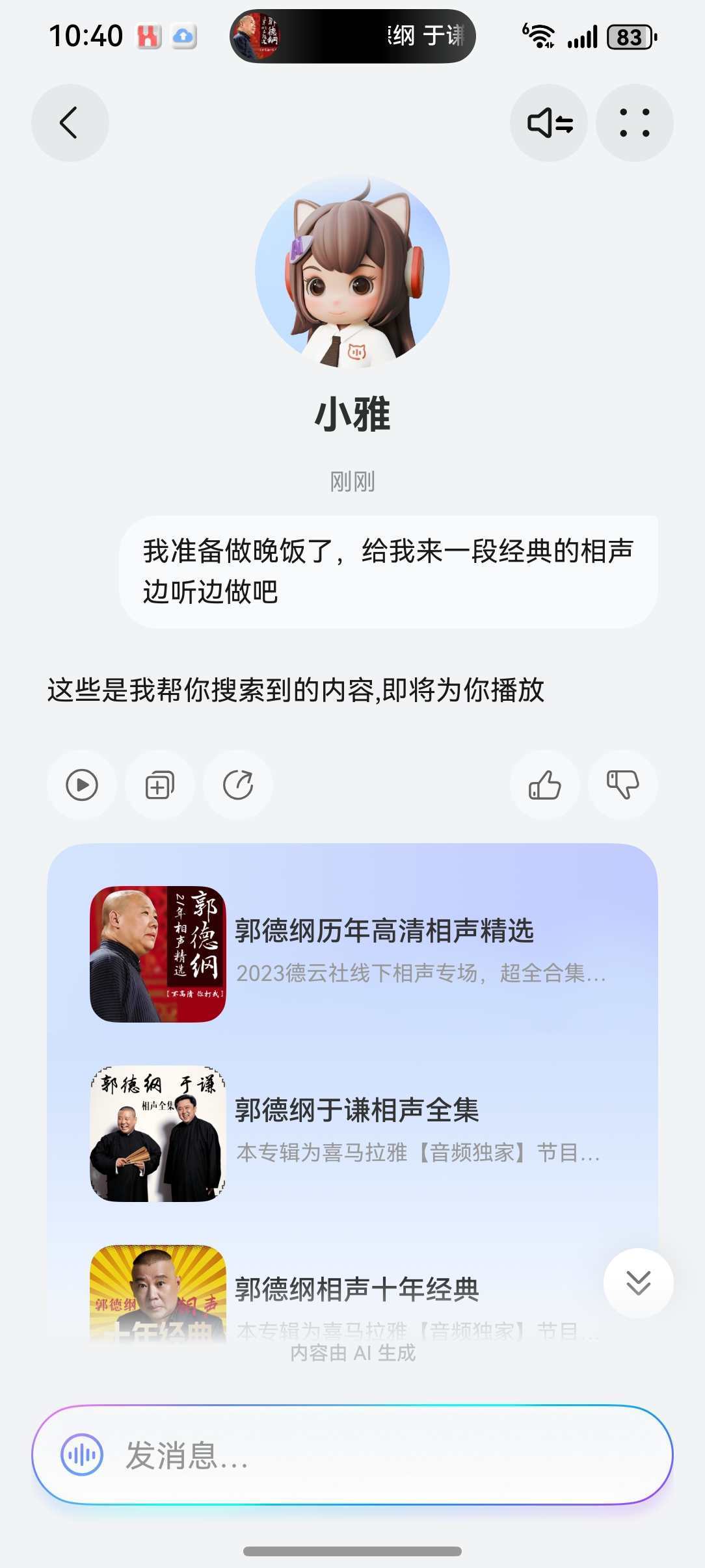 我直接说出需求:“我准备做晚饭了,给我来一段经典的相声边听边做吧。”小雅Agent立刻响应,很快推荐了好几个郭德纲的经典相声合集并开始播放。瞬间,厨房里满是谈笑声,连切菜的节奏都像踩上了段子的鼓点,心情也跟着愉悦起来。原本枯燥的备餐时间,一下变成了有滋有味的“厨房相声大会”。