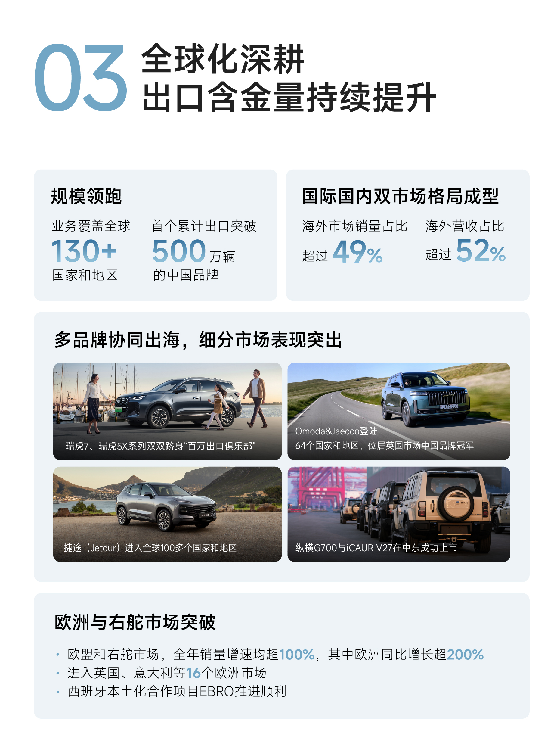 2025年,奇瑞汽车的全球化战略进入了全新阶段。从业绩报告来看,奇瑞汽车不仅在出口规模上保持领先,更重要的是出口含金量持续提升,国际国内双市场格局已经成型。这一年,奇瑞汽车的业务覆盖全球130多个国家和地区,成为首个累计出口突破500万辆的中国品牌,海外市场销量占比超过49%,海外营收占比超过52%,这些数据充分证明了奇瑞汽车全球化战略的成功。