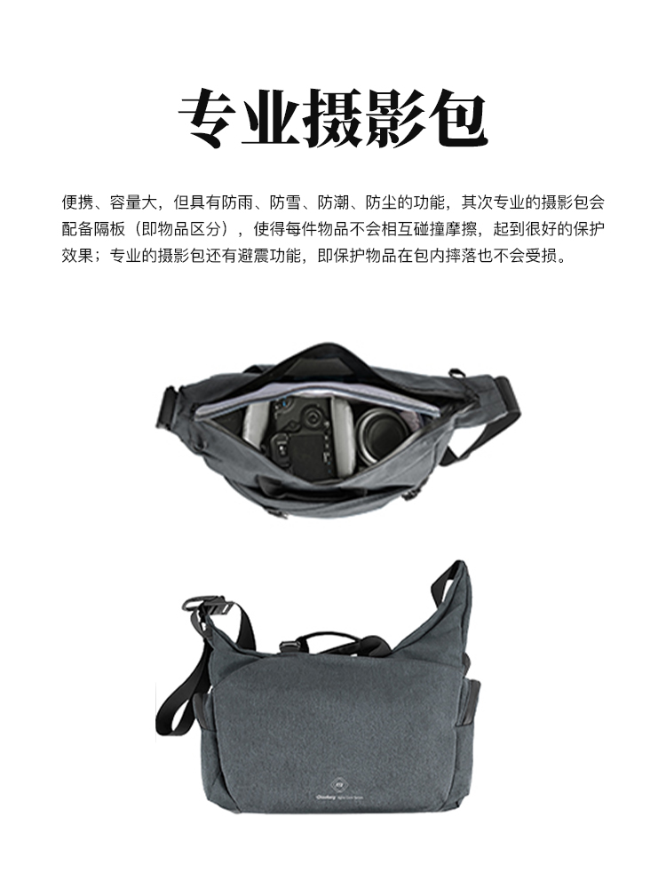 ✅专业摄影包:同样便携、容量大,但具有防雨、防雪、防潮、防尘的功能,其次专业的摄影包会配备隔板(即物品区分),使得每件物品不会相互碰撞摩擦,起到很好的保护效果;专业的摄影包还有避震功能,即保护物品在包内摔落也不会受损。