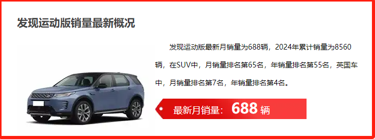 近日,路虎发现运动版的销量表现就引起了广泛关注。这款豪华SUV即便降价超过12.83万,但销量依旧低迷,最新月销量仅为688辆,2024年累计销量为8560辆。