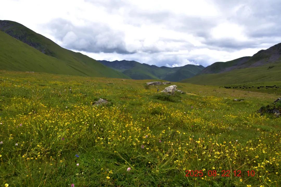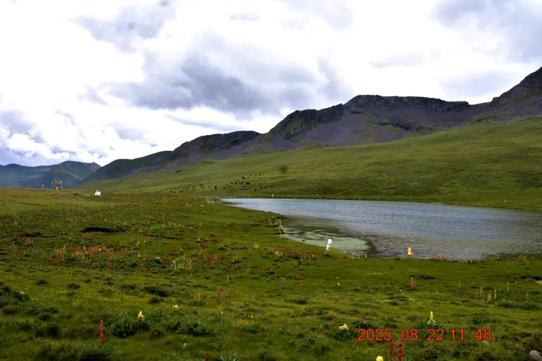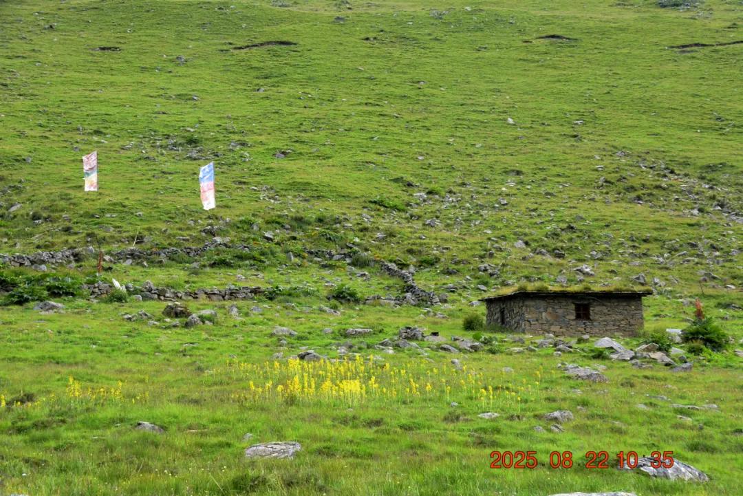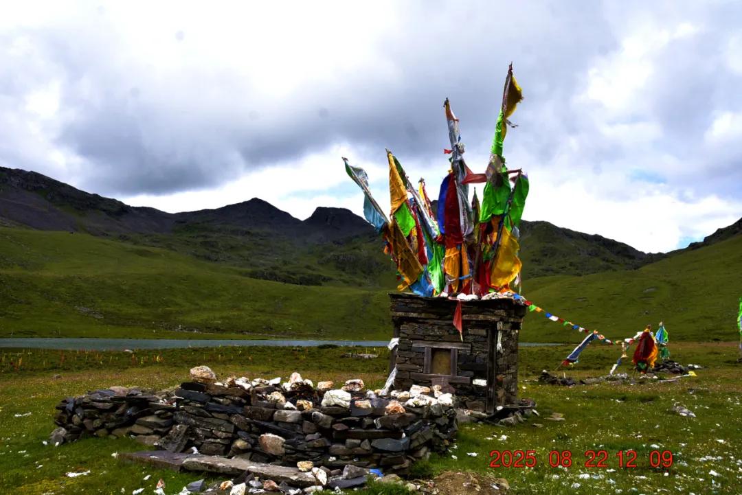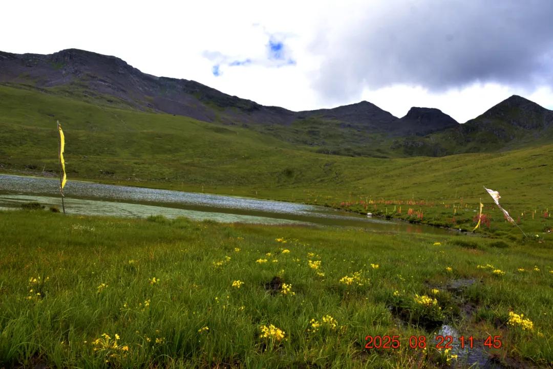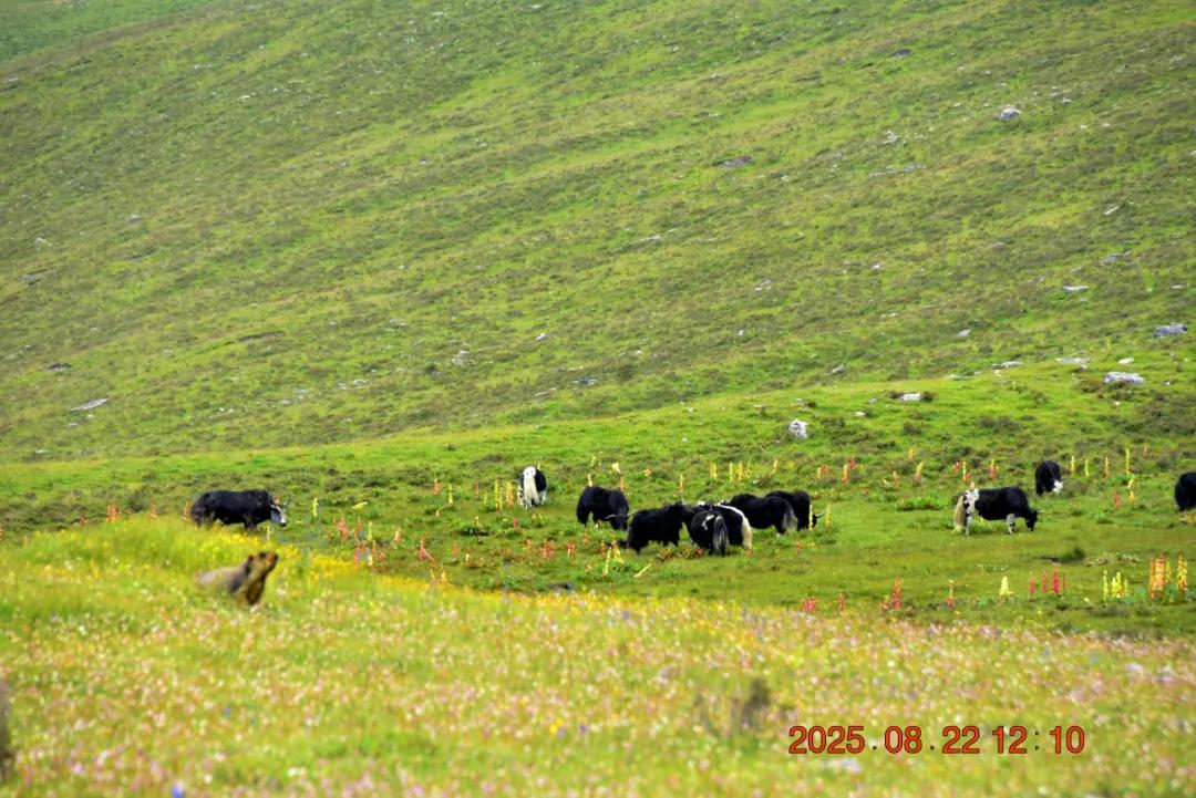 经过三四个小时的徒步,我们终于走到湖边了,湖边的花海非常的漂亮,还有一个煨桑台。湖边的成片的苞叶大黄,湖对岸山坡上有一群牦牛,整个风景非常漂亮,自然,和谐。