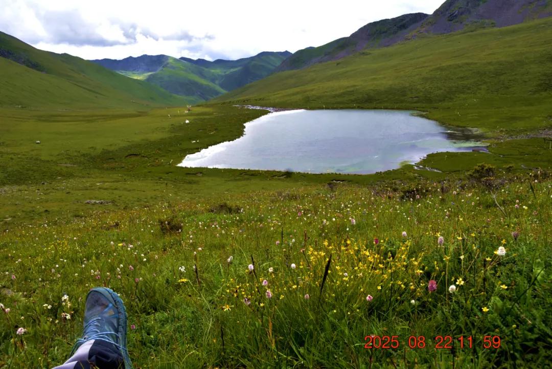 我爬到半山腰,回头看小海子全景,天地广阔,只我们几个人,还有大自然,牦牛,鸟,真想在这里静静的待一会,享受这大自然带给我们的美好,