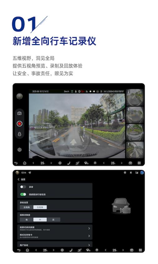 日常驾驶中,狭窄街道“鬼探头”的风险和复杂环岛路口“走错出口”的焦虑,时常考验着驾驶者的应变能力。腾势N9本次OTA新增全向行车记录仪,提供前视、前环视、左环视、右环视、后环视五视角的预览、录制及回放。当用户在行驶中遭遇侧方纠纷或者在拥挤的停车场遇到潜在剐蹭时,腾势N9能够提供360°无死角的影像记录,让安全眼见为实。