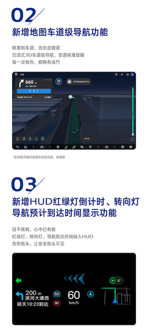 当车辆驶入陌生街道,新增的地图车道级导航功能将传统模糊的靠右行驶指令升级为沉浸式的3D车道级精准指引,将驾驶者从路线选择的犹豫中解放出来,让每一次变道、转向都胸有成竹,从此再也不会走错路。为了让驾驶更专注,新增的HUD红绿灯倒计时、转向灯、导航预计到达时间显示功能,实现了“视线不离路,信息全掌握”,极大地提升了行车安全性。