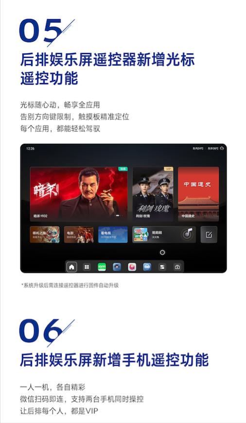 不仅如此,操控体验的升级同样精彩。后排娱乐屏遥控器新增光标遥控功能,告别传统方向键的限制,触摸板精准定位让每个应用都能轻松驾驭。更令人惊喜的是,后排娱乐屏新增手机遥控功能,微信扫码即连,支持两台手机同时操控,让后排每个人都是VIP。