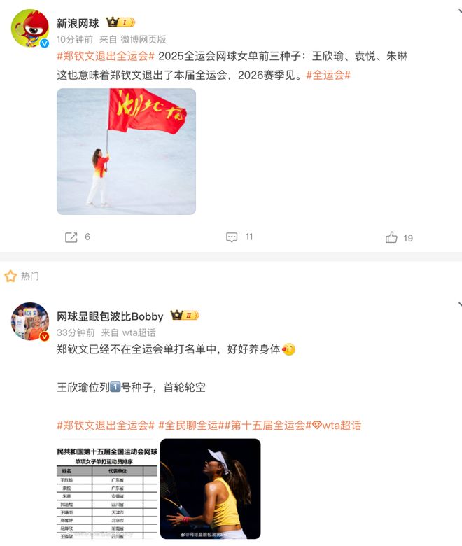 北京时间11月12日,中国网球一姐郑钦文在此前开幕式出任湖北代表队的旗手后,如今根据多家媒体报道,郑钦文已经退出全运会女单比赛,王欣瑜递补成为女单1号种子。郑钦文下半年连续因伤退出多站赛事,如今在全运会退赛并不令人意外。