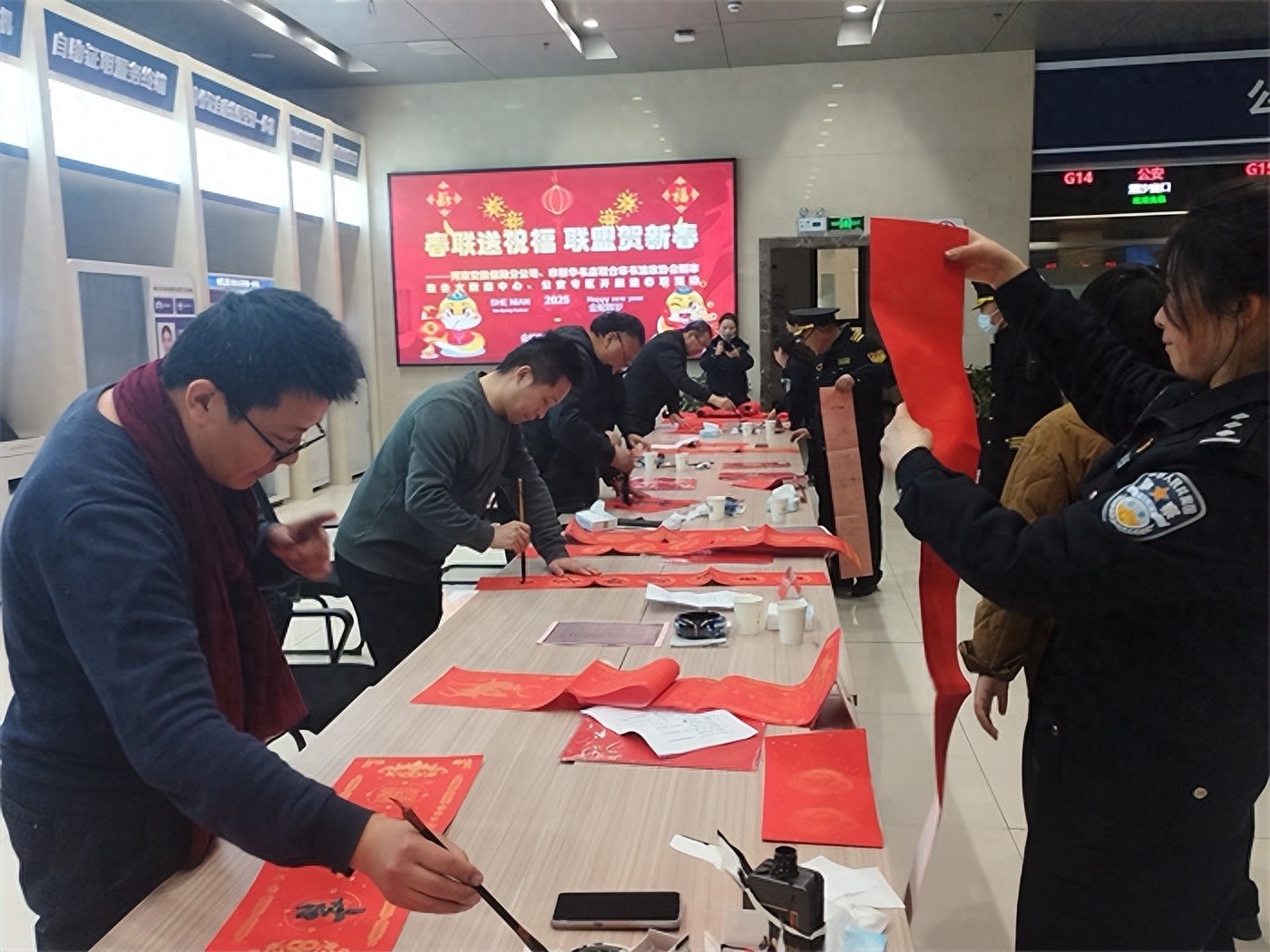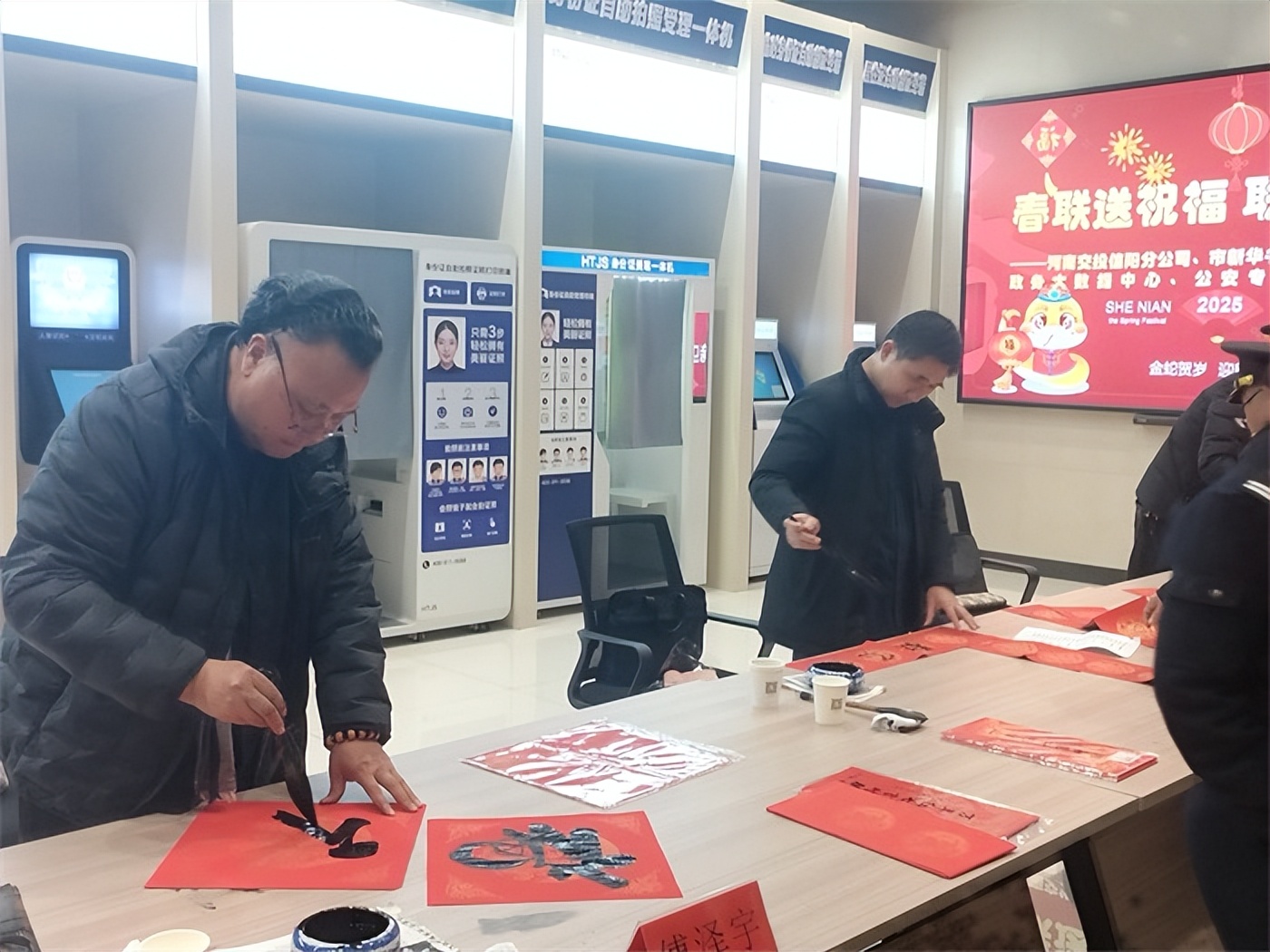 千门万户曈曈日,总把新桃换旧符。为深入传承中华优秀传统文化,喜迎新春。1月23日,信阳市政务大数据中心行政审批服务科(公安专区)党支部党建联盟单位河南交通投资集团信阳分公司机关党支部、市新华书店机关党支部邀请信阳市文联副主席、市书法家协会主席傅泽宇等5位书法名家在市政务大数据中心公安专区举办“春联送祝福 联盟贺新春”活动,为市民朋友们烹制了一场心意满满的节日文化大餐。