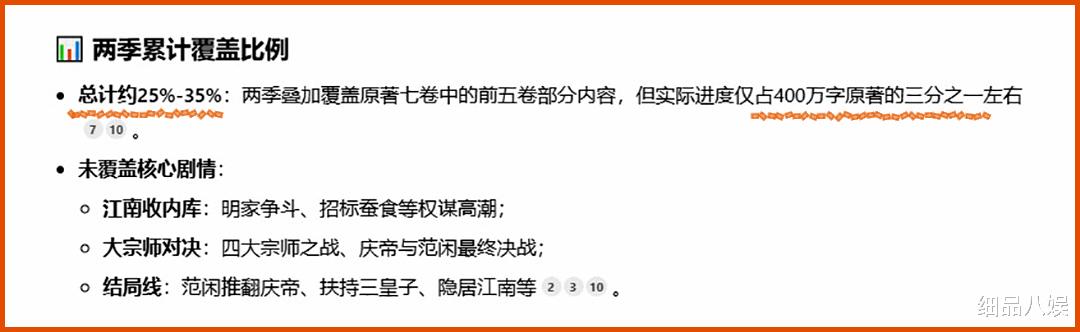 据统计,《庆余年》前两部只拍出了原著三分之一左右的内容。第三部大概率拍不完剩余的三分之二,想看大结局的观众可能还得等第四部、第五部。