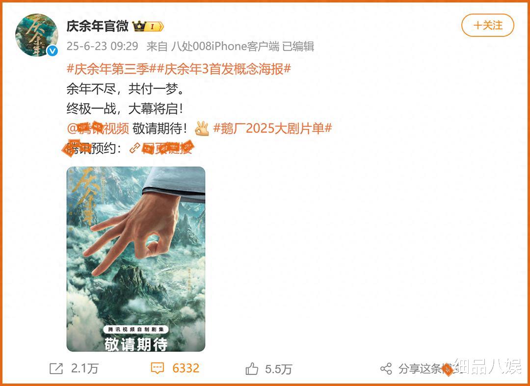 现在,《庆余年3》才发布了一张海报,开机日期尚未明确。如果依然遵循前两部的制播周期规律的话,最乐观的估计下,《庆余年3》也得2027年暑期才能开播。