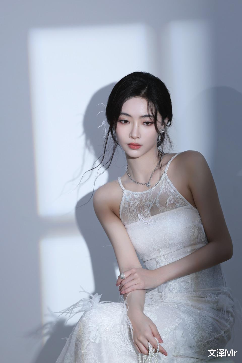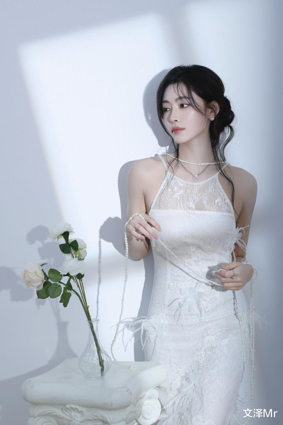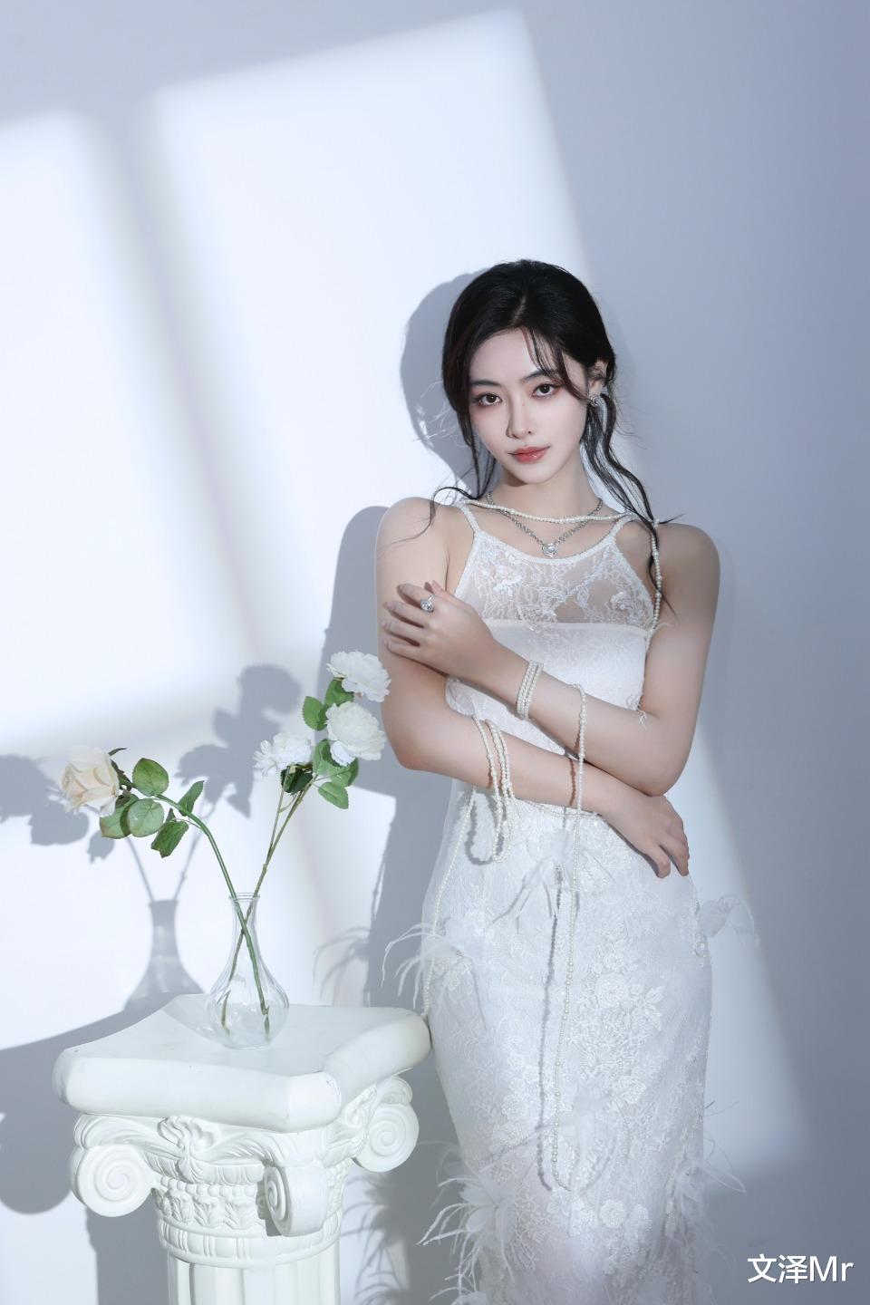 白色墙面投射出斑驳光影,许佳琪身着白色蕾丝吊带裙立于其中,手中那串长珍珠链不仅是配饰,更是贯穿这组大片的视觉线索。这件裙装的设计极为考究——精致的镂空花纹在光照下形成微妙阴影,增添立体感却不显繁复。她将头发利落梳起,露出完美的颈部线条和清晰的肩部轮廓,这种“留白”处理反而凸显了五官的精致度。妆容上,她选择了近乎裸妆的淡雅风格,仅以柔和眼影与自然唇色点缀,却意外地让眉眼间的灵气得以完全释放。在纯白背景下,她仿佛是一幅刚刚完成的素描,每一笔都恰到好处。