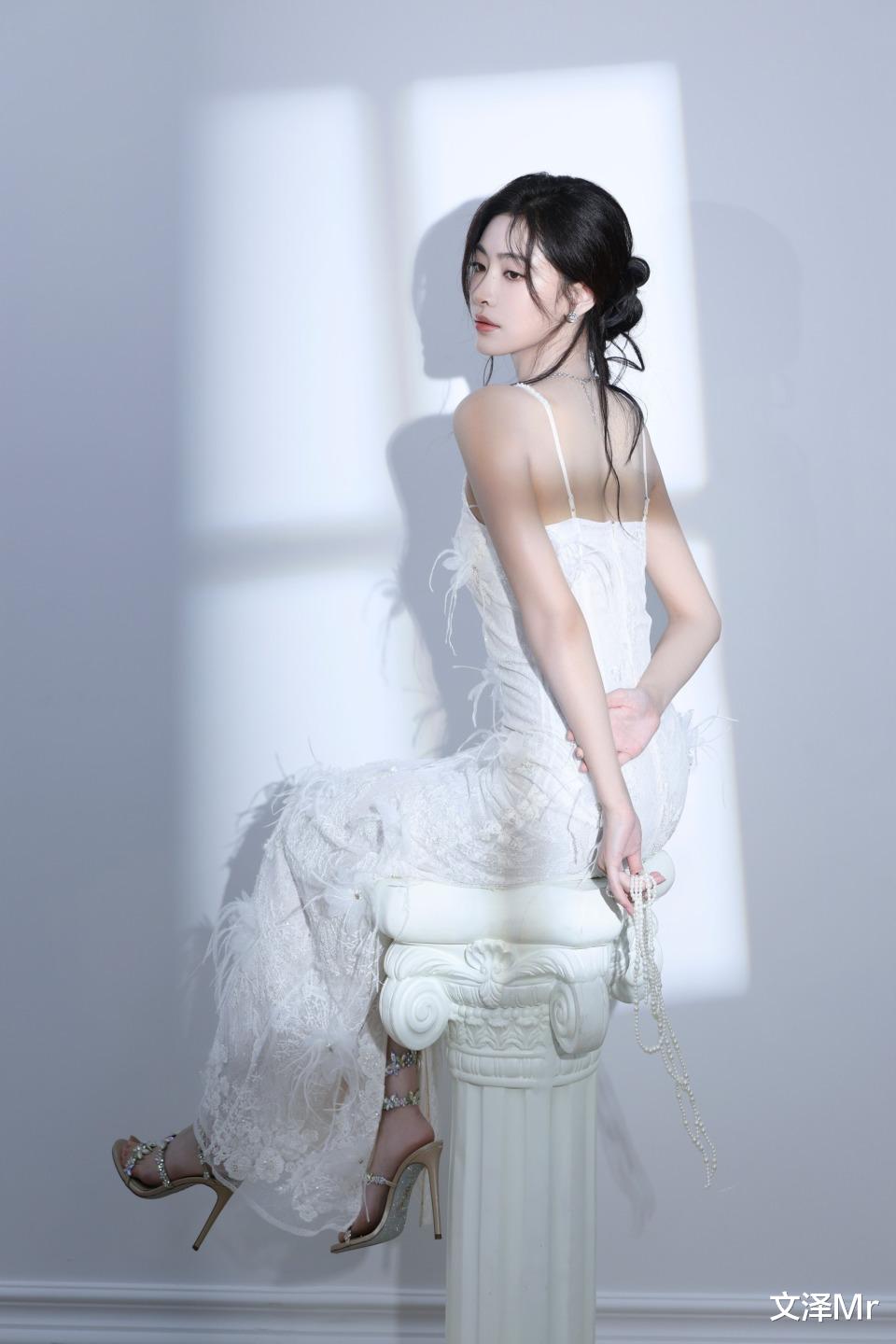 许佳琪侧坐于白色立柱上,这个姿势对核心力量要求极高——既要保持平衡,又要展现放松状态。一手轻放腰间,一手握着珍珠链,这个姿态让身体形成流畅的S型曲线。吊带长裙上的羽毛元素从局部装饰变为整体设计语言,随着坐姿铺展开来。脚上的精致高跟凉鞋和脚踝闪亮饰品,是容易被忽略却至关重要的细节——它们完成了“从头到脚”的造型完整性。
