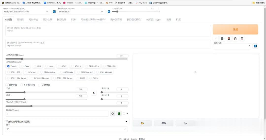 上面是写Prompt的地方,下面是一排密密麻麻的天书一样的参数:反响prompt、迭代次数、采样方法、CFG、Seed等等。