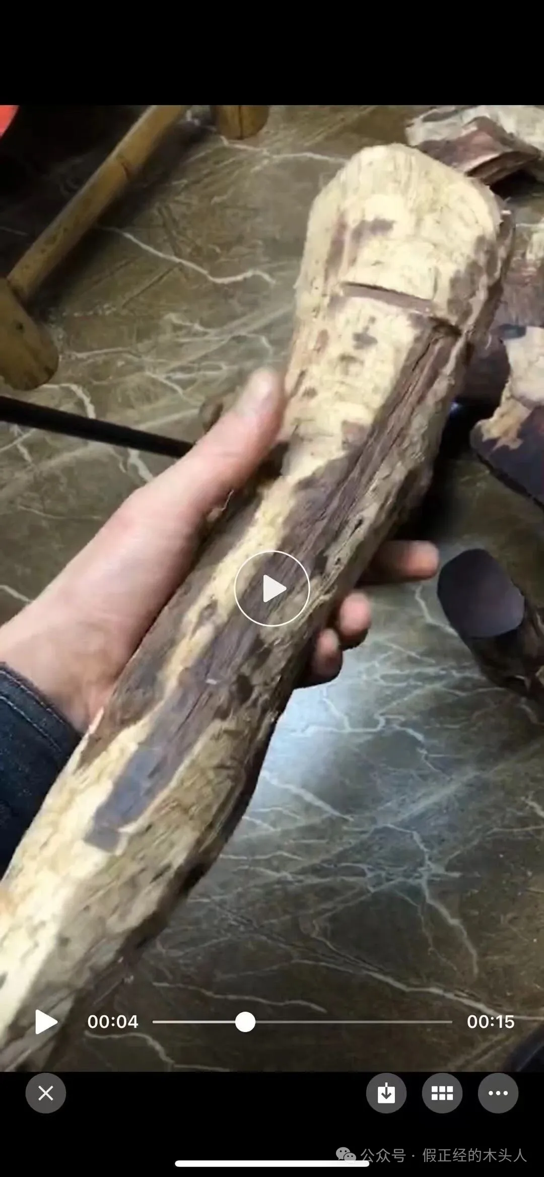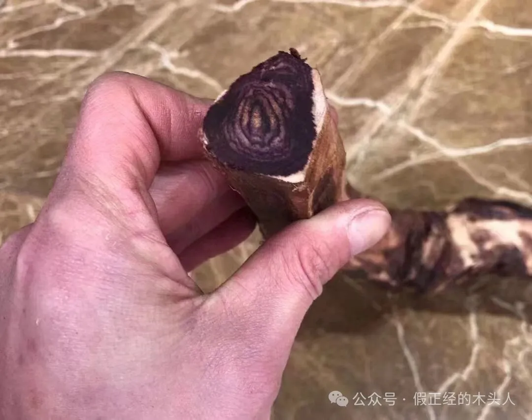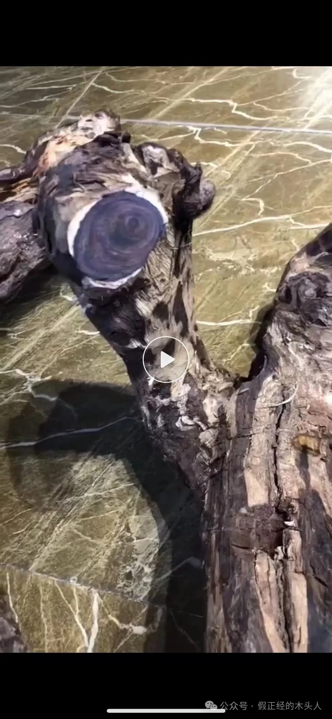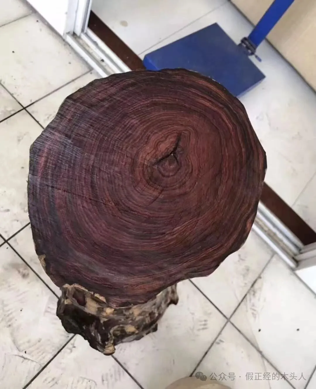 问题在其纹理走势上:就算是瘤疤钉瘤疤花这类特殊纹理,在瘤疤本体之外的顺纹,也必然会表达出木本类植物纹理圈圈套叠的特性,不存在圈不是圈,圆不是圆,纹理乱长,全然无规律的表达。